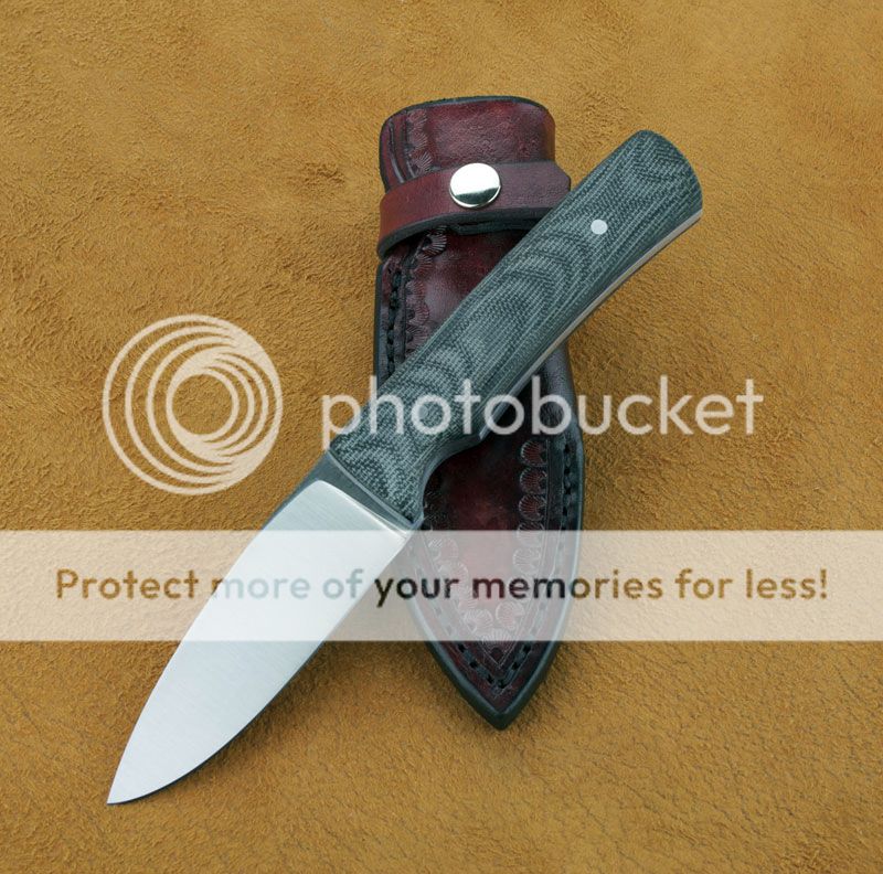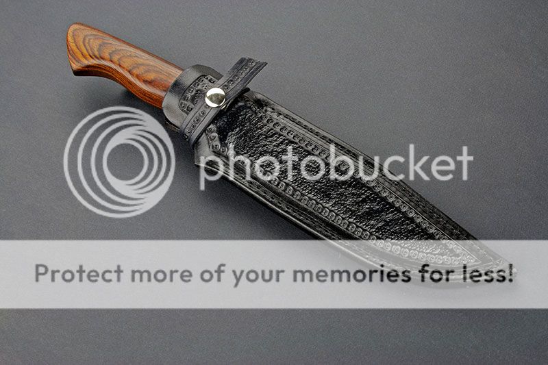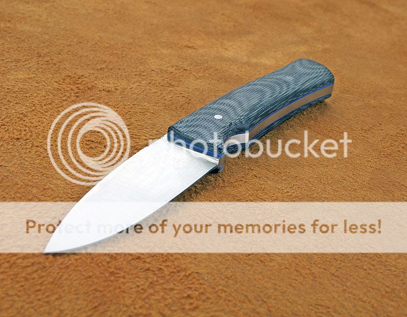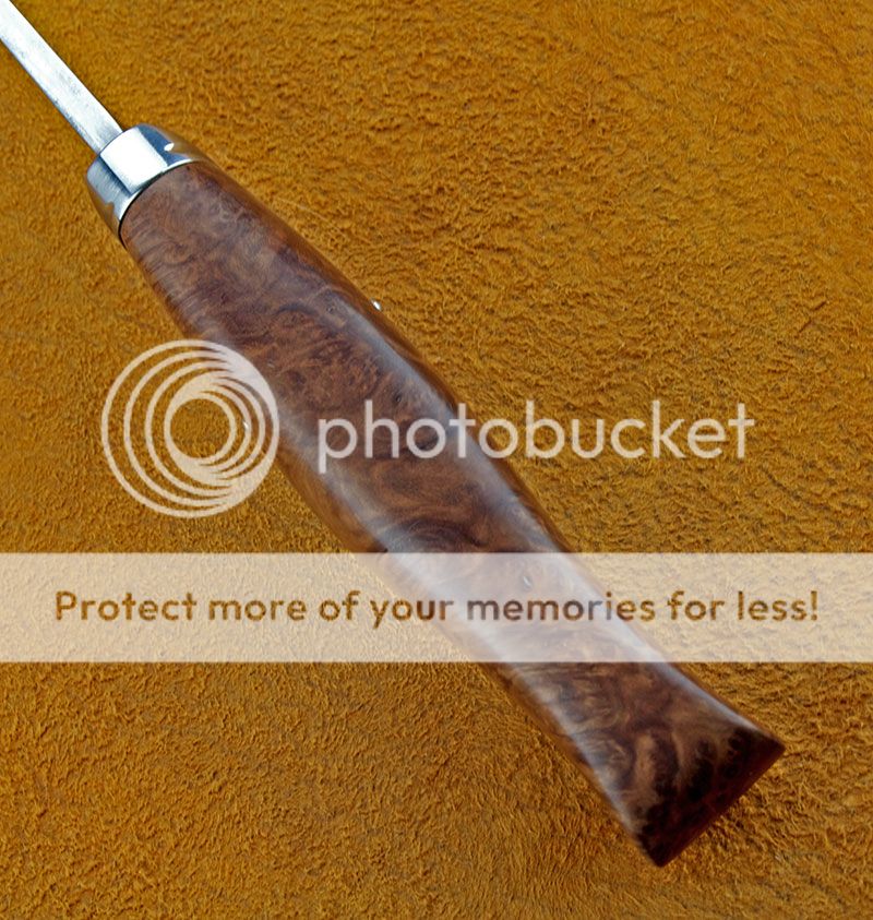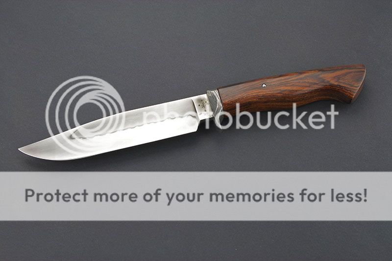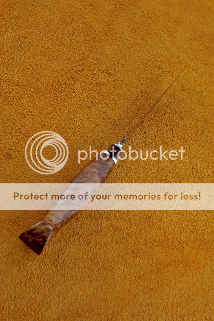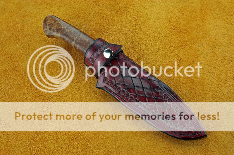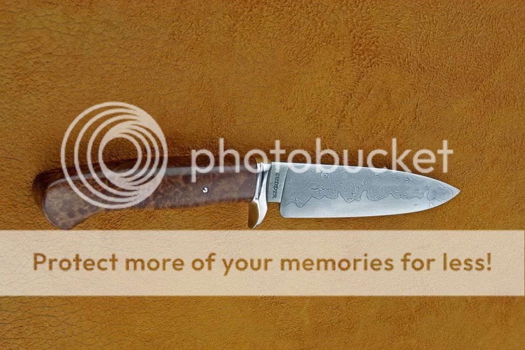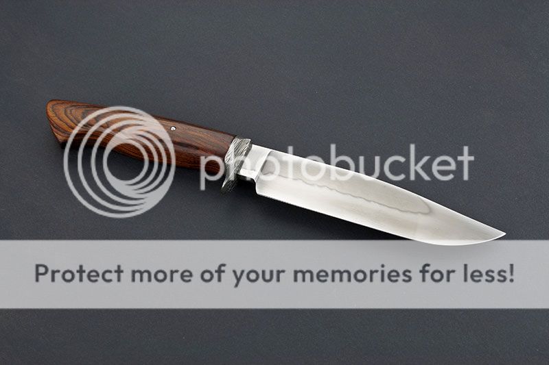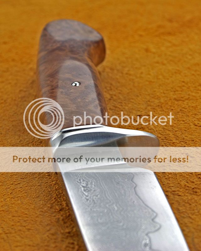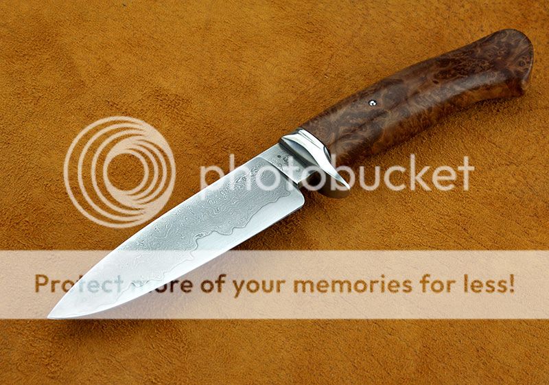 San Mai, cant remember how many layers of 1075 and 15N20 ( but its alot ) with a core of 1095. Stainless guard, domed pin with Red Mallee Burl handle.