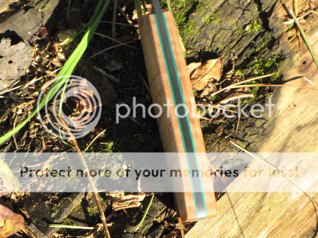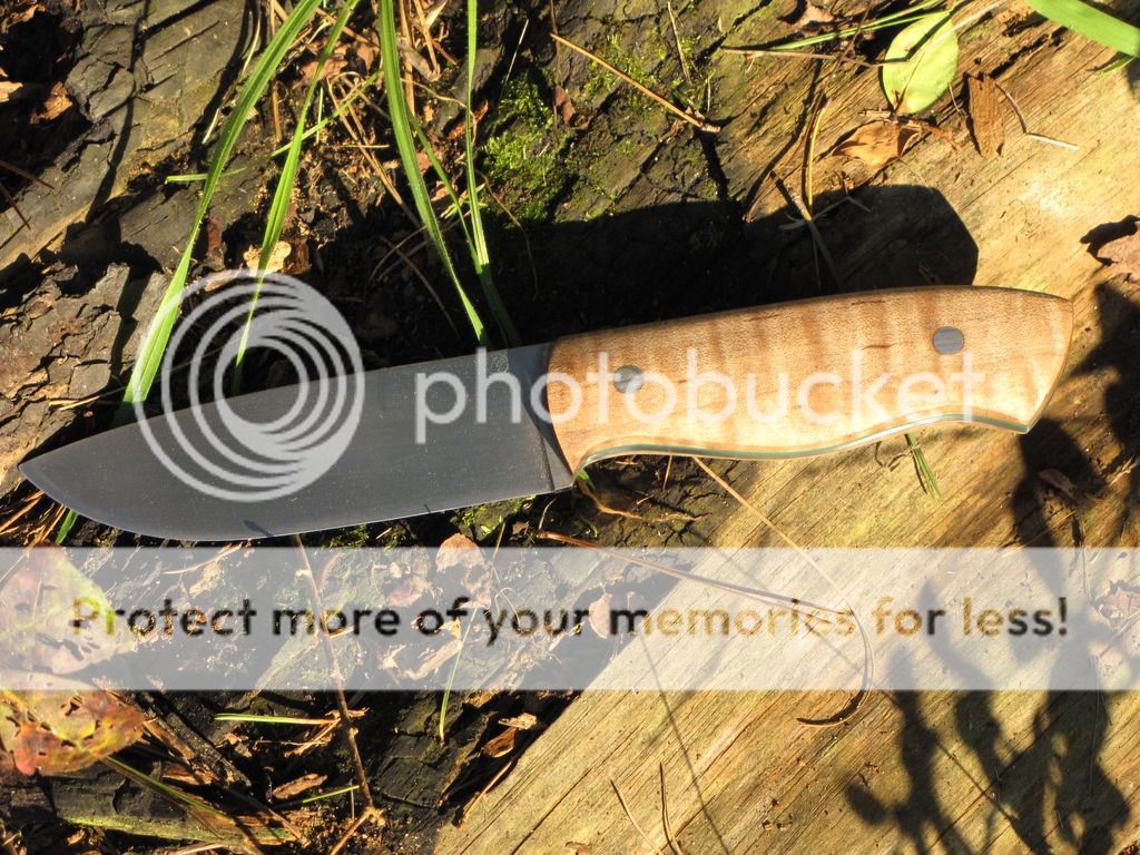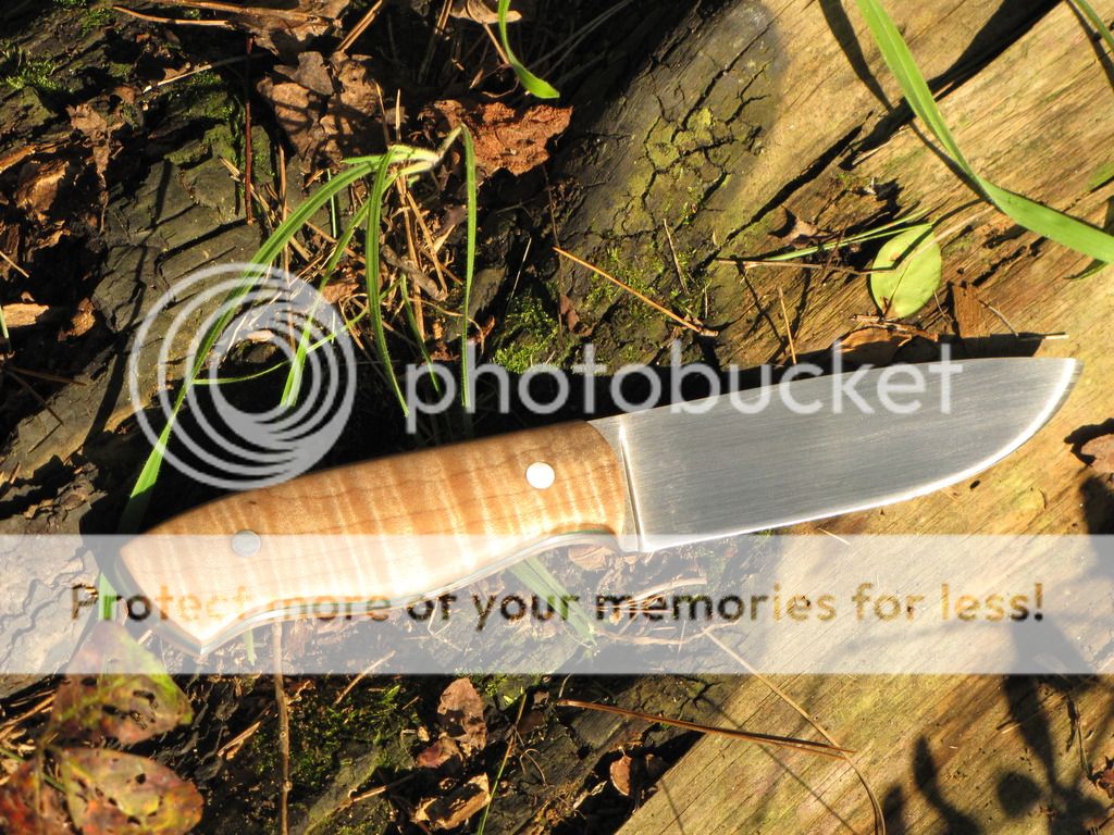 Here's an Ogle Creek in 1/8" O1. The blade is about 4 1/2". Hand sanded to 400-grit. Heat treated to 59-60 RC. Flat ground with a convex edge. The handle is about 4 1/2" with stabilized curly maple, green vulcanized paper liners, stainless corby bolts. Comes with 6-7 oz. leather sheath, right or left handed.