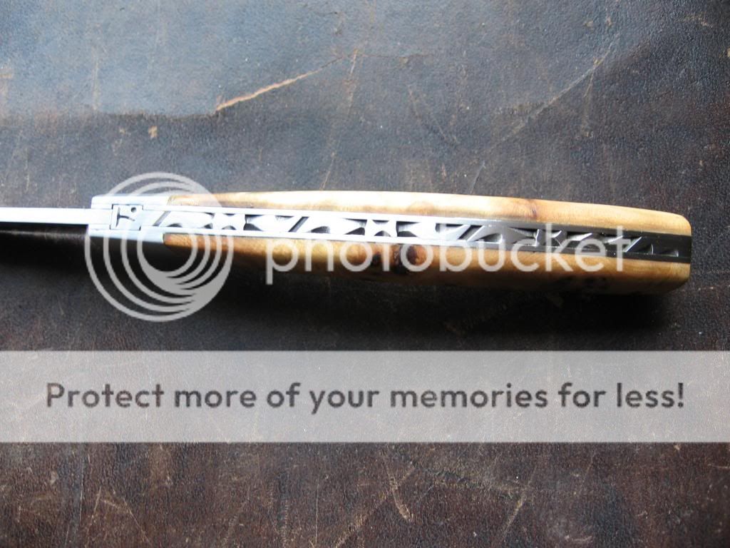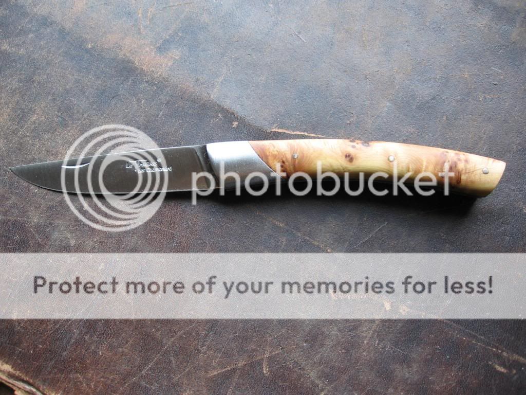 I picked this little Thiers up on the exchange and all I can say is wow. Such an elegant, simple design that fits your hand so perfectly. The Juniper scales add to the simple beauty of this knife, the fit and finish is close to perfect. The blade to backspring join is virtually invisible and the blade is razor sharp. I can see more of these on the horizon. Help feed my addiction and post pics of yours. Sorry for my always bad pics