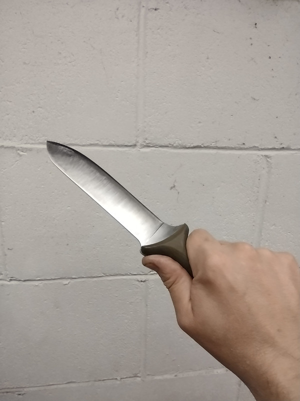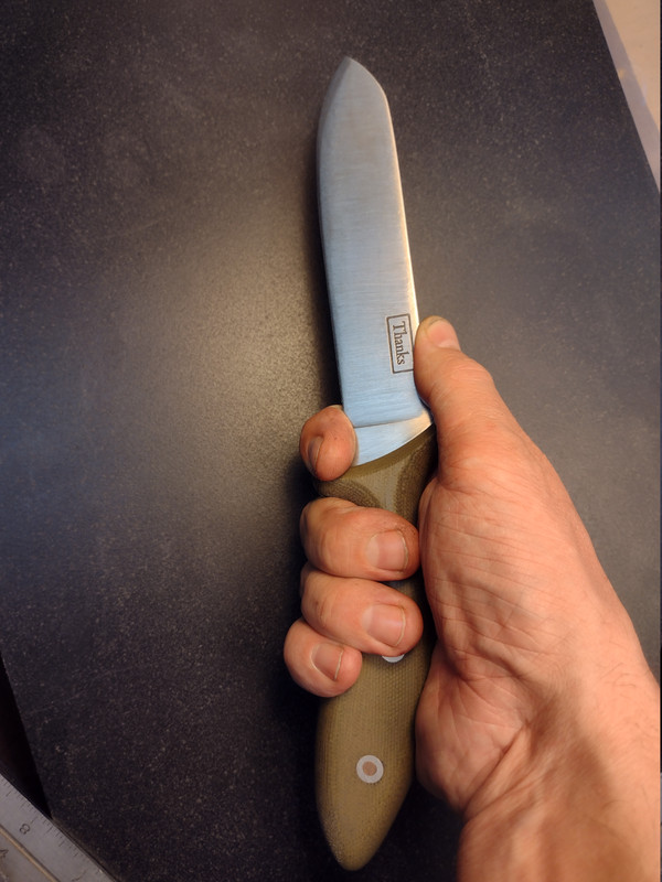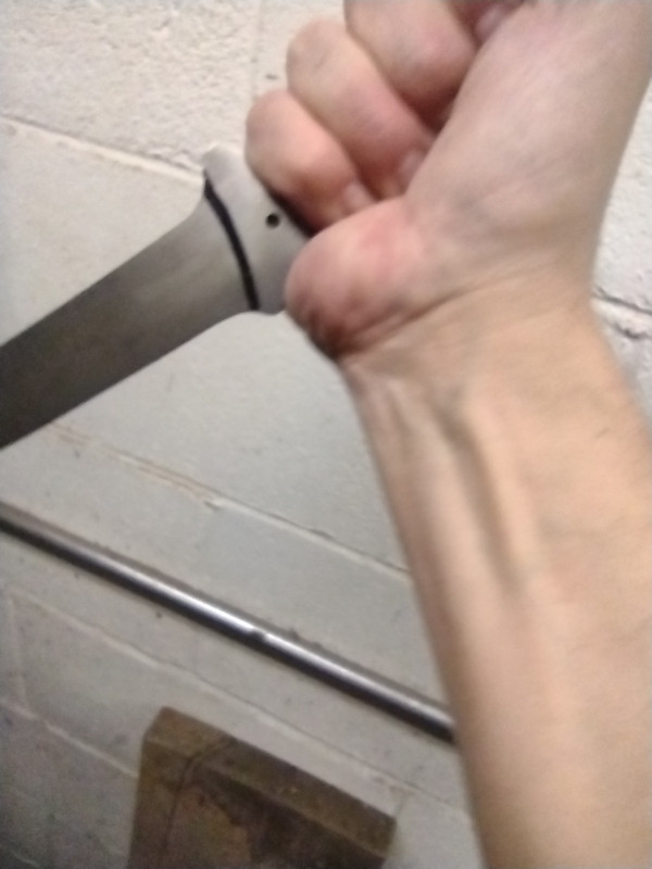 It's not perfect. I don't like the large choil of the BK5, nor do I care for the false edge on top. The handle was bulky, but when I chopped it, something special happened. A bigger blade became easier to carry and Use.