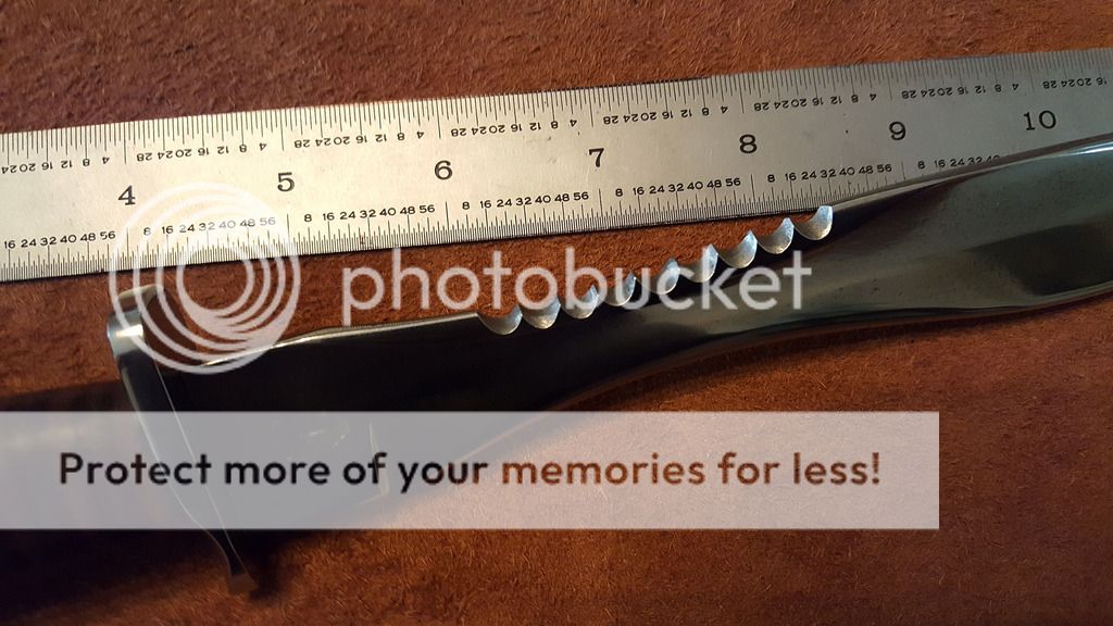 The recurve blade is just shy of 7 inches long and very sharp. Total length of the knife is 11.5 inches weight is 8.6 oz. Point of balance is at the guard so it feels very light in the hand.The nine serrations on the top are hand filed and very aggressive. The blade is an inch high at the guard and 3/16ths thick. In all likely hood the steel is 1095 or 1084 (handle enough of this stuff and you get a feel for it) and hardened and tempered to a Rockwell 59 or so. You can get a pretty good feel for the hardness of the blade when you put the final edge on it. The bevels are taken to 2500 grit the flats to 650 then polished. It came out really well. The grind on the blade converse, good for cracking through things. Most of the tang was replaces with 416 Stainless Allscrew which was silver brazed to the remainder of the old tang. The leather washers are ..well leather washers. The guard and butt plate are also made from 416 stainless.