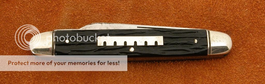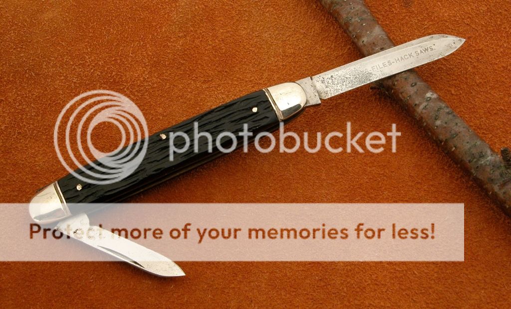 This 3 & ½ pen knife has faux stag handles (not my favorite but no shrinkage and solid bear trap snap and tight). Interestingly the master blade has a double etch one on the mark side and one on the pile side but no tang stamp (which was probably not done in lieu of the mark side etch of the company Simonds Saw & Steel Co (1922-1940 as per Goins). Unfortunately the pile side etch is slightly hidden by tarnish and hard to see the Sa in Saws-Files-Hack Saws but the mark side etch of Simonds Saw & Steel Co is clear. I should also note that some but not all of their knives were made on contract by Camillus. Not sure about this one.