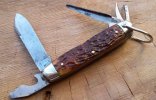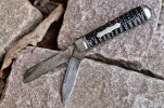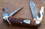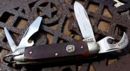 A 3'' horn handled shadow pattern, with two blades and scissors. The only tang stamp is an image of a crown, the letters "I" and "R", and crossed keys or flags, or maybe it's a picture of scissors?