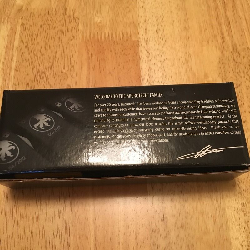 $old>>Bought this one to be a safe queen but decided to let it go since it kills me to have something and not use it. Comes with matching factory box and all paper work . It's a MicroTech so not much needed to say , Rock solid lockup , lightning fast that opens with Authority and pretty much dead center blade .
