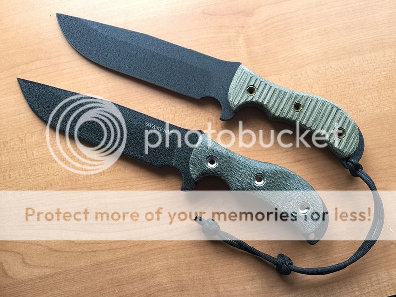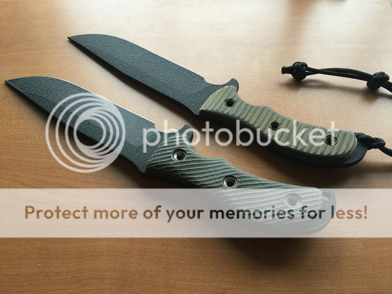 Anyway, comparing these two, the first thing that was apparent to me today was the handles; the latest offering (which I was fortunate enough to order before last call back in October last year) sports that signature diagonal cut micarta, and I love it. Handle is wider too, you know, "thickerer" than my old school version. And nicely contoured, with even more curves. I didn't think the bodacious, beefy Ratweiler could possibly have any more curves, but Busse figured out a way.