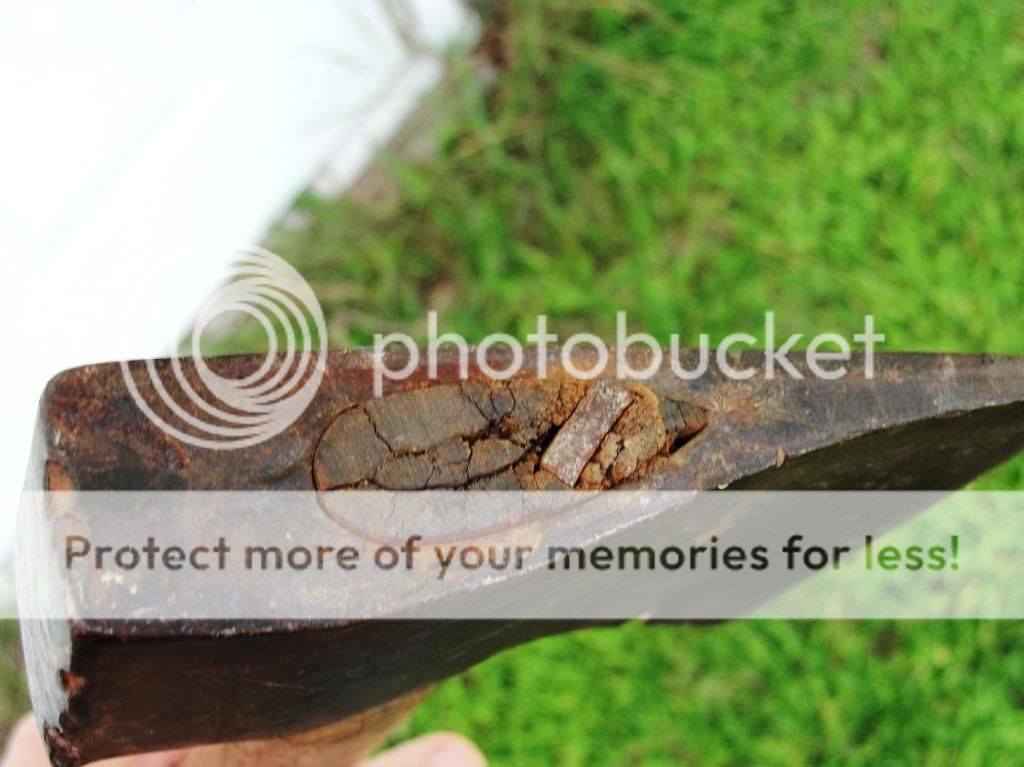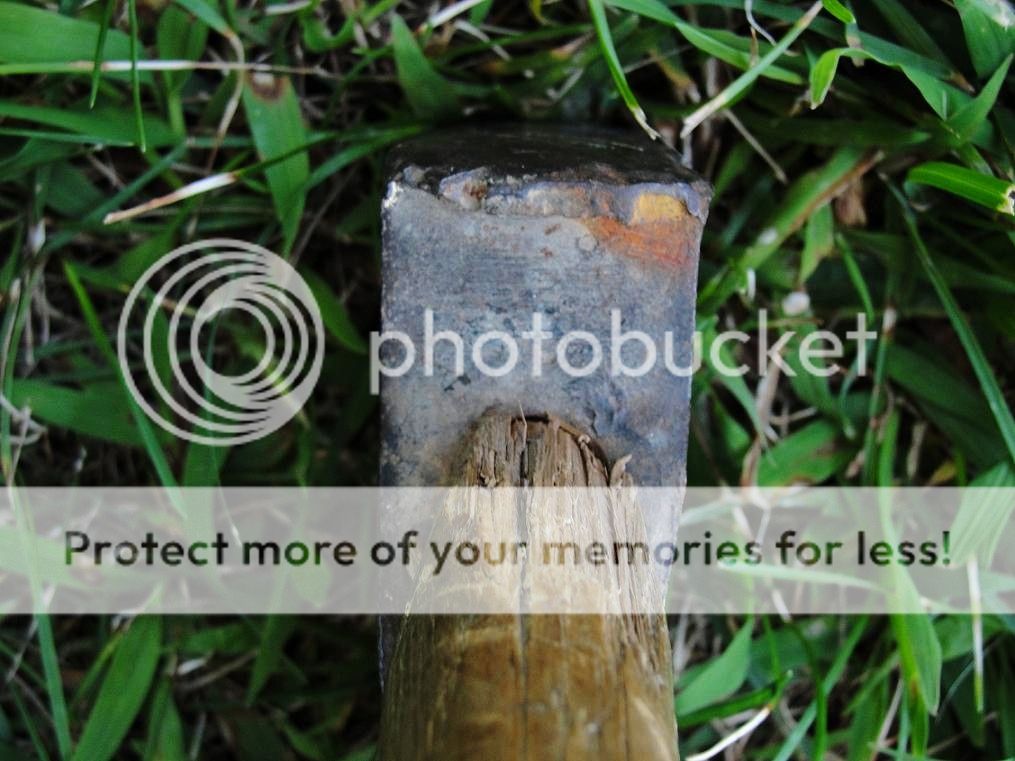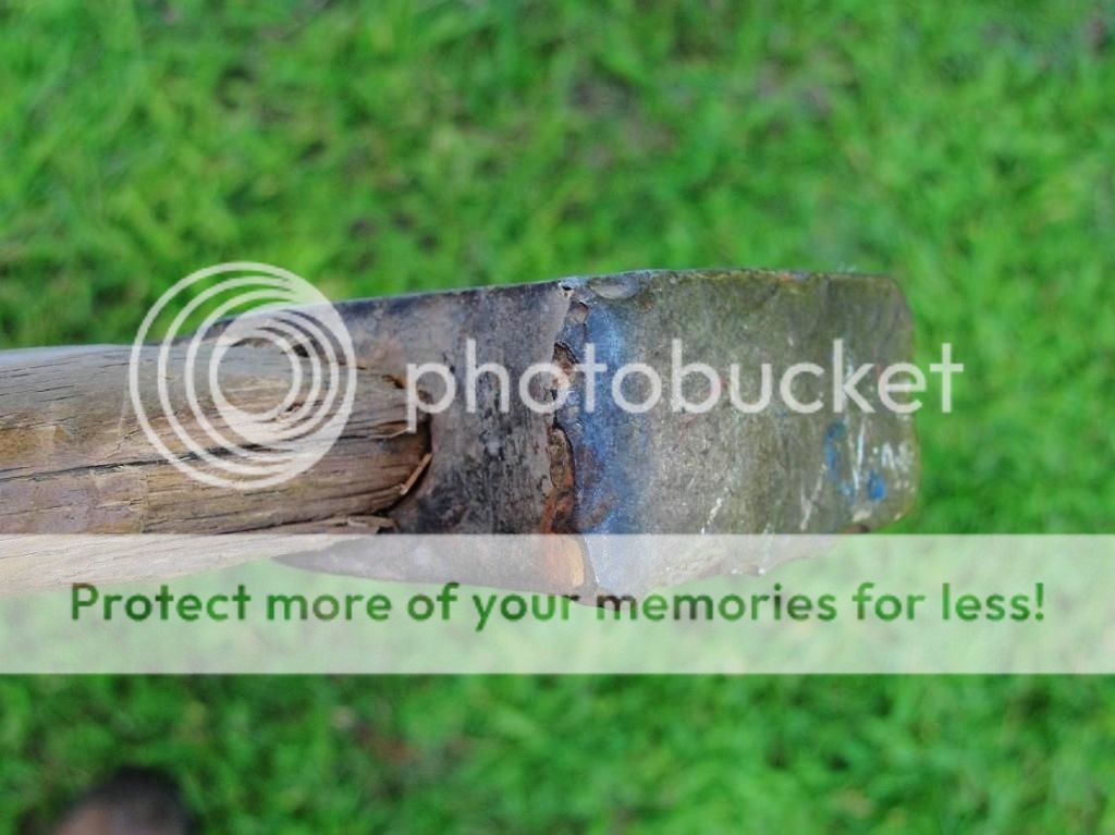 The handle looks really compromised, with lots of wood spiderwebs as seen in the next few photos. You can also see the left side of the blade is flat, while the right side of the hatchet head makes a pronounced inward curve, and also has the single bevel edge similar to my old jeweler's hand graver set. The gravers WERE easy to keep a sharp edge maintained,......possibly the reason here?