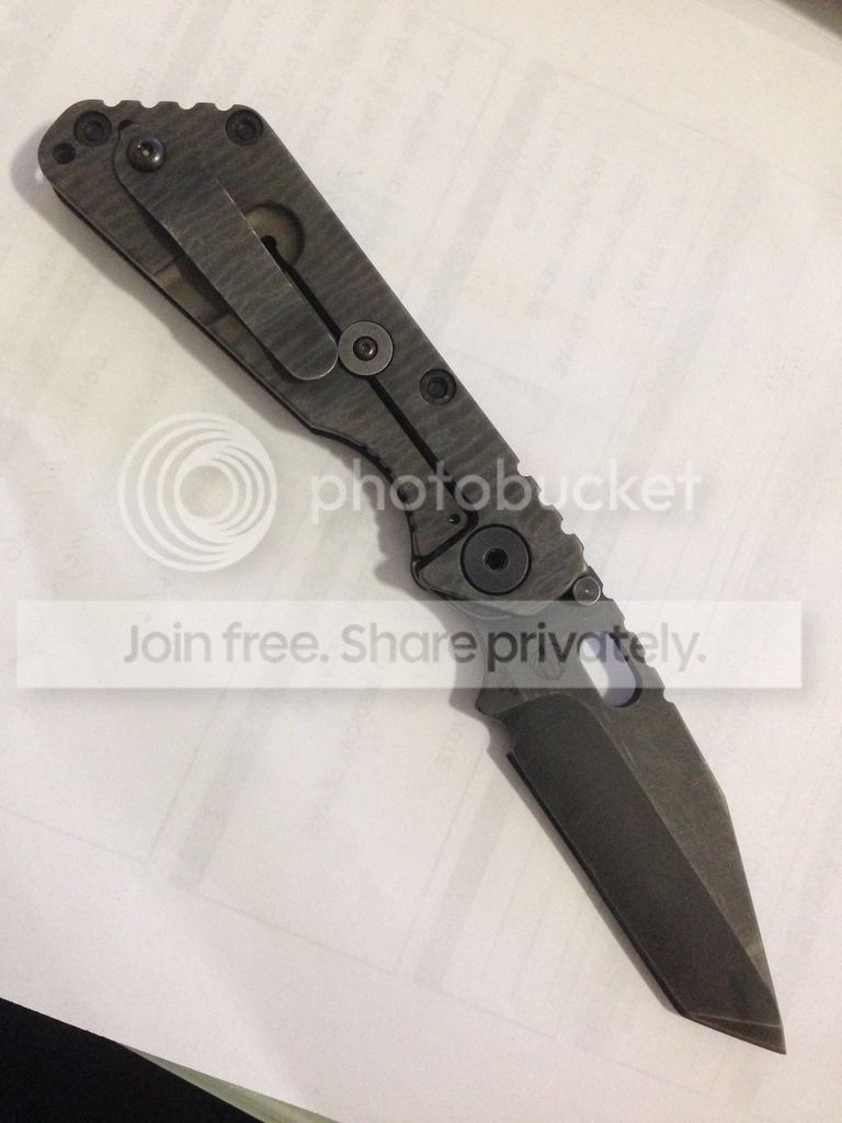 User strider tanto - s30v black oxide blade , has some wear - Lego handle - flamed Ti. Comes with green tritium hardware including the pocket clip screw..these were $25 a screw when they were available- long discontinued. I don't have original hardware.