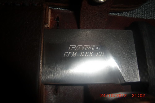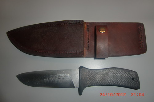 CPM-REX 121 steel, flat ground with a slight convex, handle is lightning carbon fibre, red fibre spacers. 10 ¾” overall with a 6” blade, 0.187 thick, 68-70rc. Leather sheath, left and right