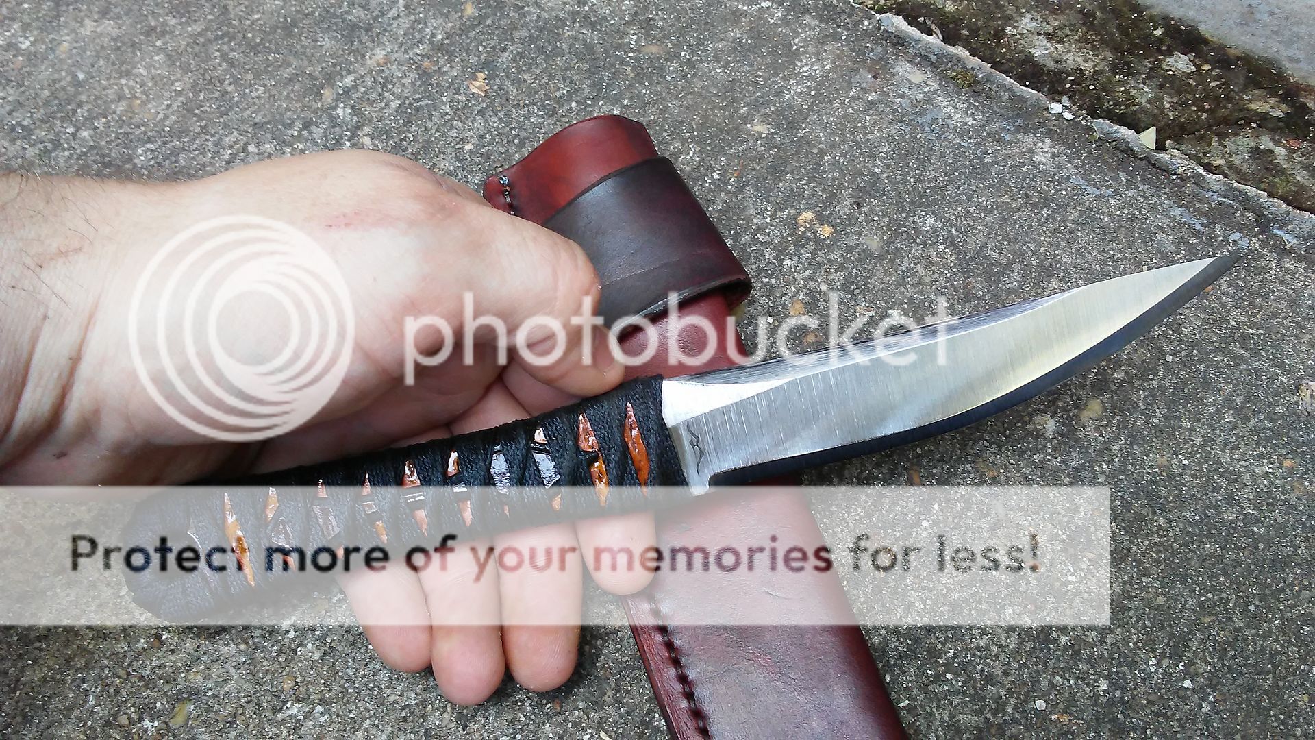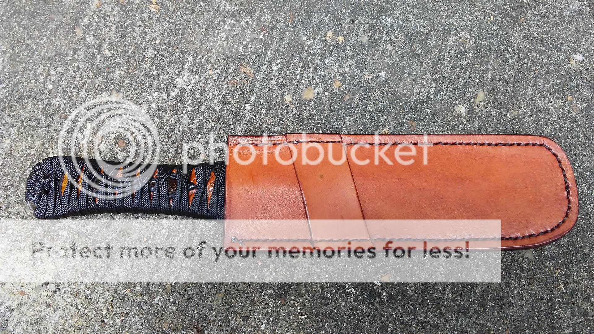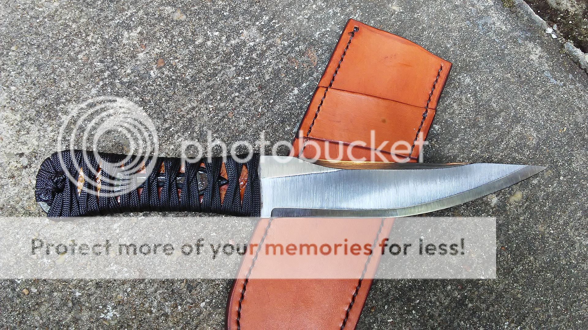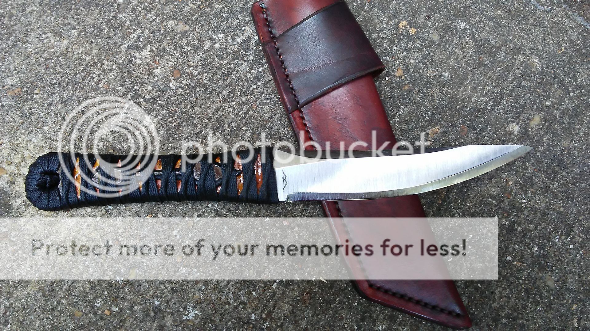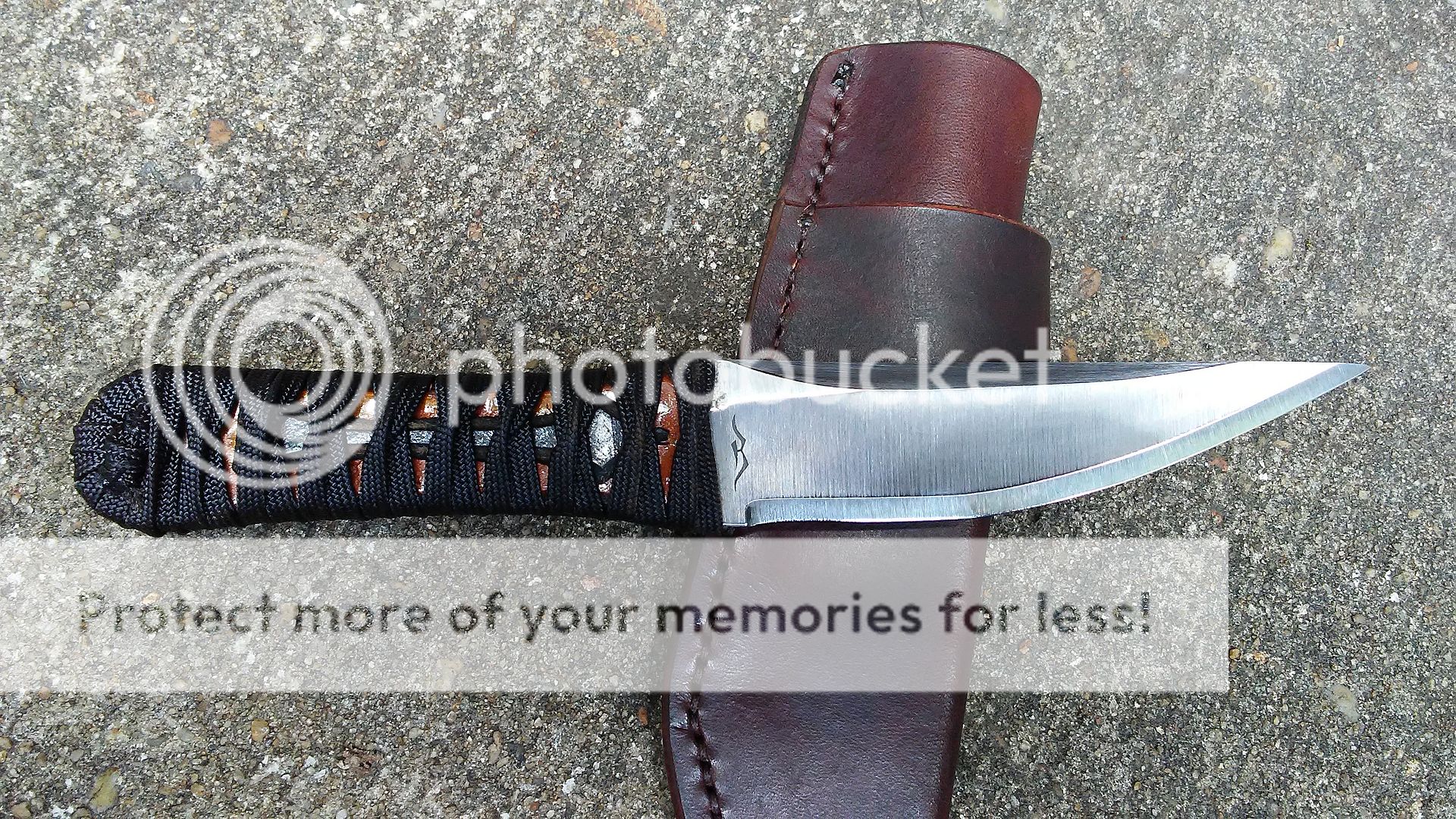 This kwaiken is made from 1095 carbon steel and is ground with a right side chisel grind. The handle has leather panels with a leather arrow menuki. Its over wrapped with dark brown paracord that was soaked with resin. The resin made the paracord super dark. They were oil quenched then tempered to be 59-60RC in hardness. It comes with a leather cross draw sheath. 8 1/8in long X 3/16in thick X 1in wide. Handle length 3 7/8in.