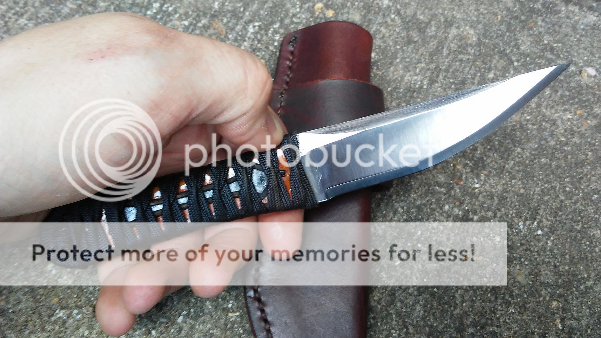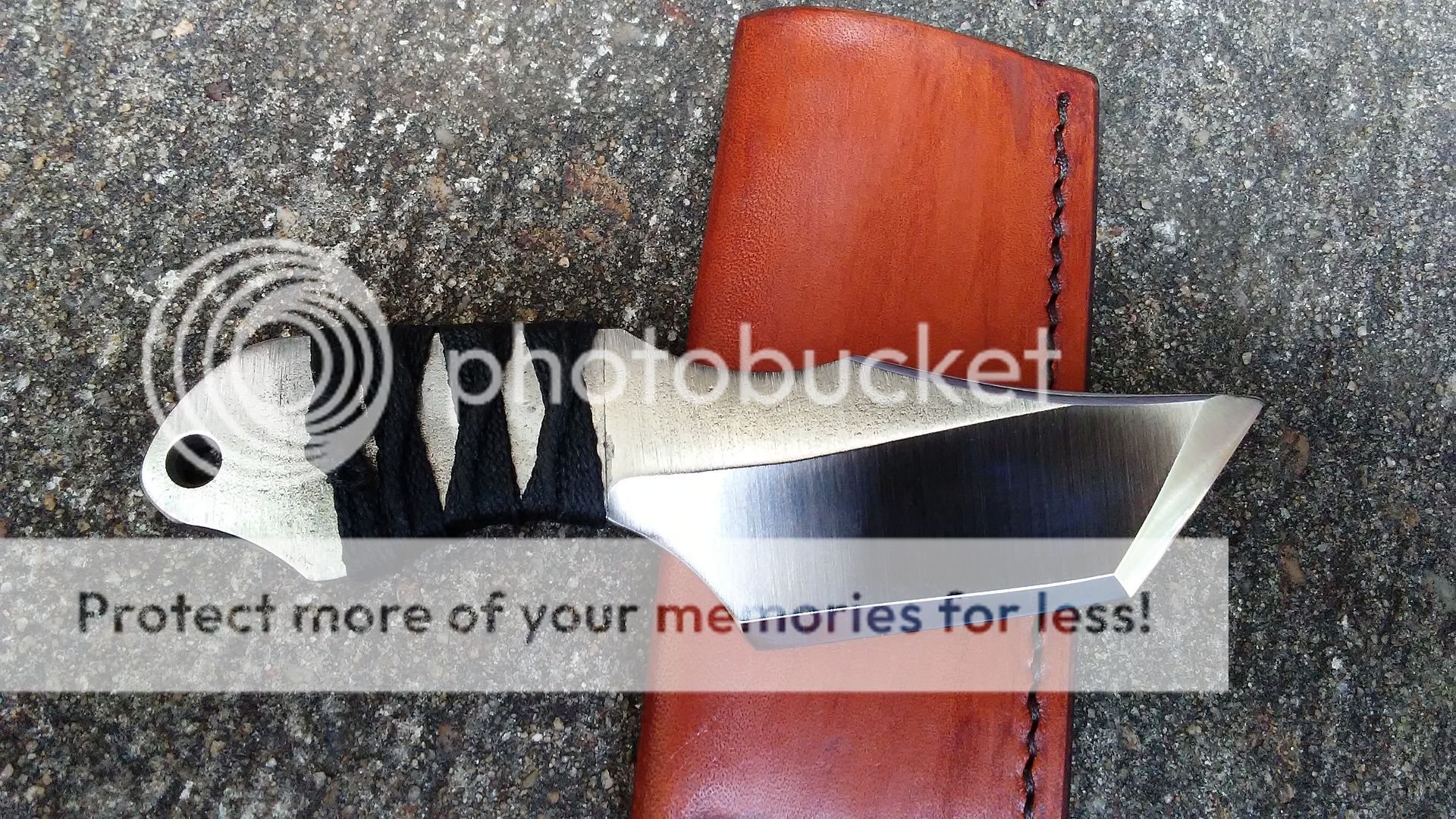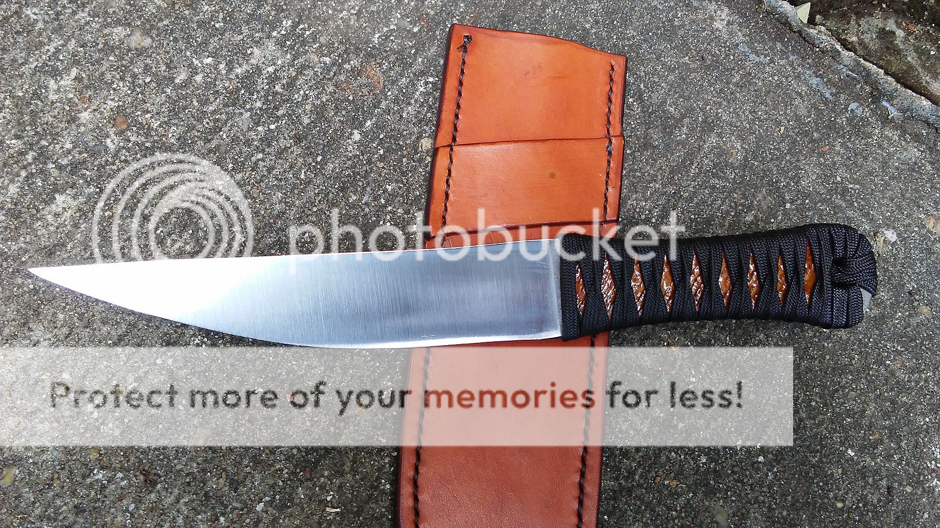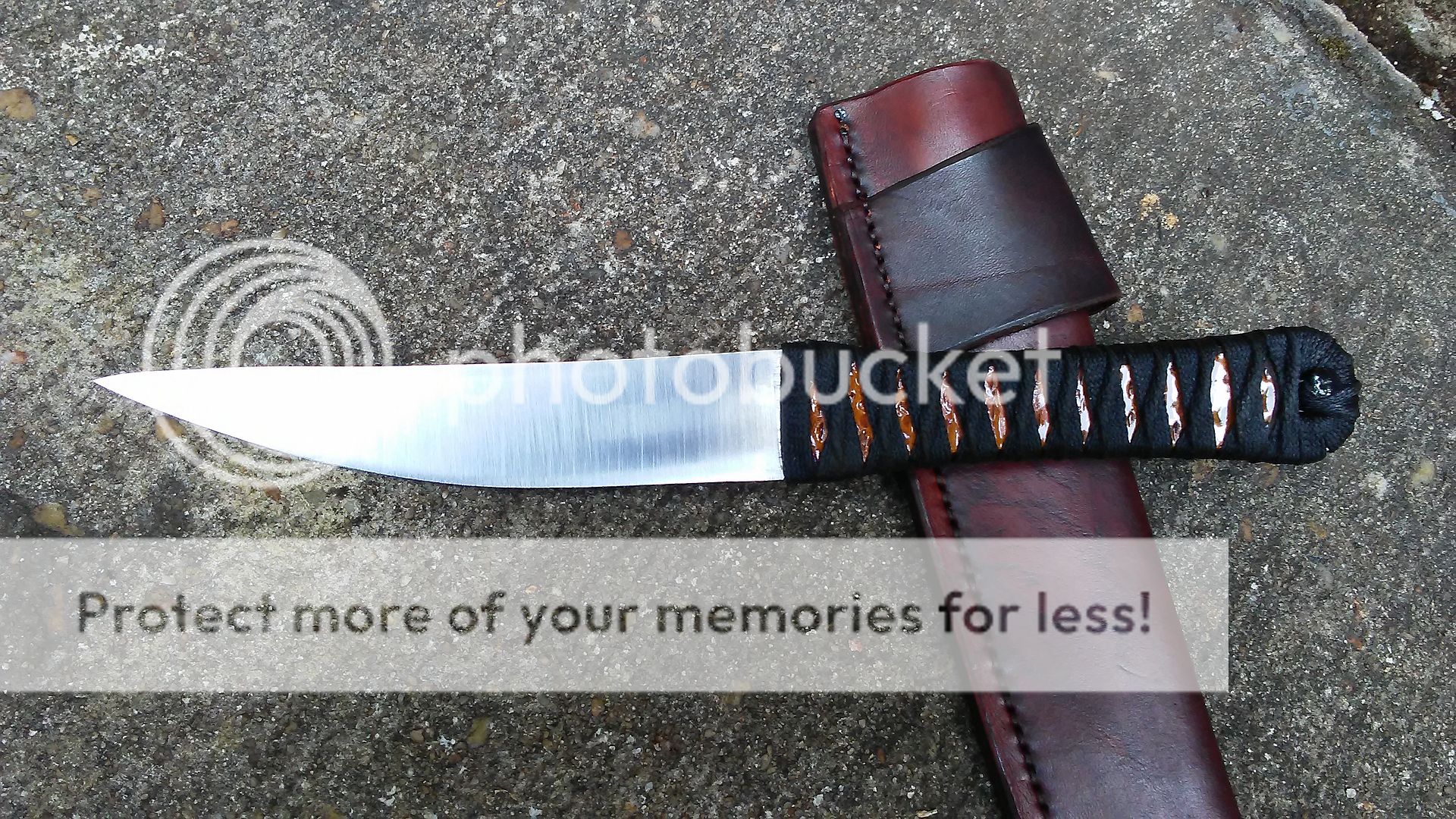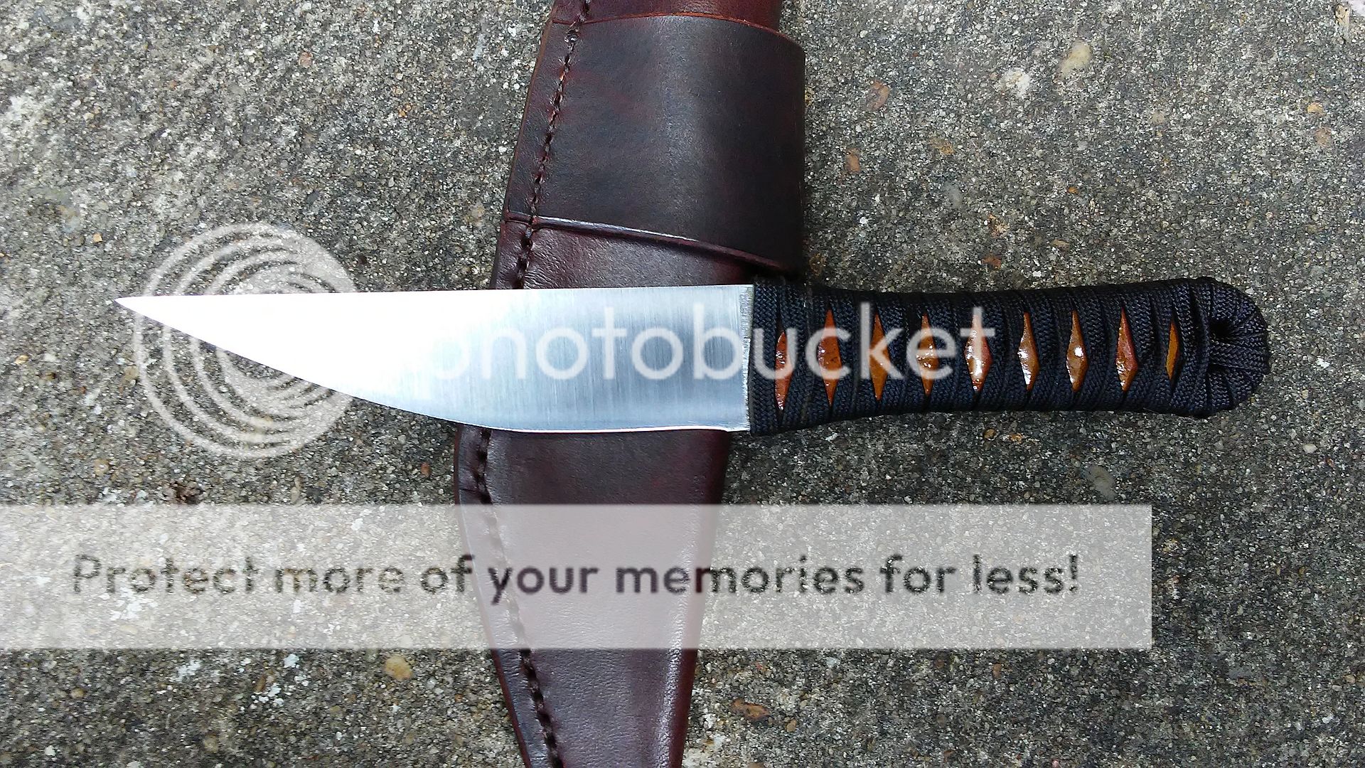 This tanto is made from 1095 carbon steel and is ground with a right side chisel grind. The handle has leather panels with a leather arrow menuki. Its over wrapped with dark brown paracord that was soaked with resin. The resin made the paracord super dark. They were oil quenched then tempered to be 59-60RC in hardness. It comes with a leather cross draw sheath. 10in long X 3/16in thick X 1 1/4in wide. Handle length 4in