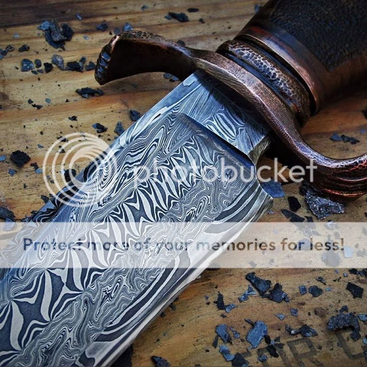 Well I had another nice photo from Caleb Royer sent over today that I have been dying to share. I finished this one around Halloween and it was built around the idea of "what would Van Helsing use?" For those unfamiliar Van Helsing is the original slayer of Dracula and was the center of a blockbuster about ten years ago where he battles all sorts of evil creatures. Originally this knife blade was intended for a different blade, but when the customer wasn't quite happy with the pattern of the damascus it became destined for something else. I wanted the channel the vampire hunter vibe into different aspects of the knife and I think it came through pretty well, especially with the tombstone bandoleer. Everything on this knife is sole authorship and this sheath was a BIG step forward for me. So as always comments and critiques are always welcome. Thanks for looking!