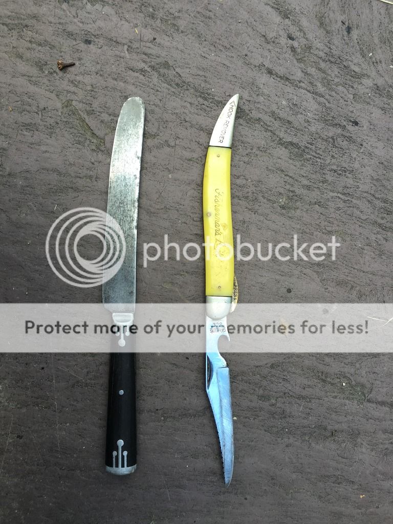 The old table knife is from the 1800's I'm pretty sure, though some rural folk used them into the 1900's. Ebony handles with (certainly) lead-bearing pewter. I think it is safe to eat with if you don't suck on the handle or soak it with your other utensils and dishes. I rubbed the handle with linseed oil and buffed the knife with steel wool. I probably do not plan to eat with it anyway.