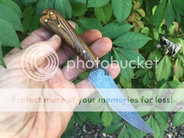 One of the first knives that I forged from a wire rope with an unfortunate hammer blow. Everything welded nicely and the divot will not affect the use of this little knife. It's been on the back of my workbench for months and I thought someone might make use of it if I offered it at a fire sale price.