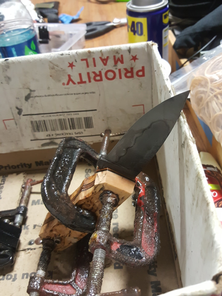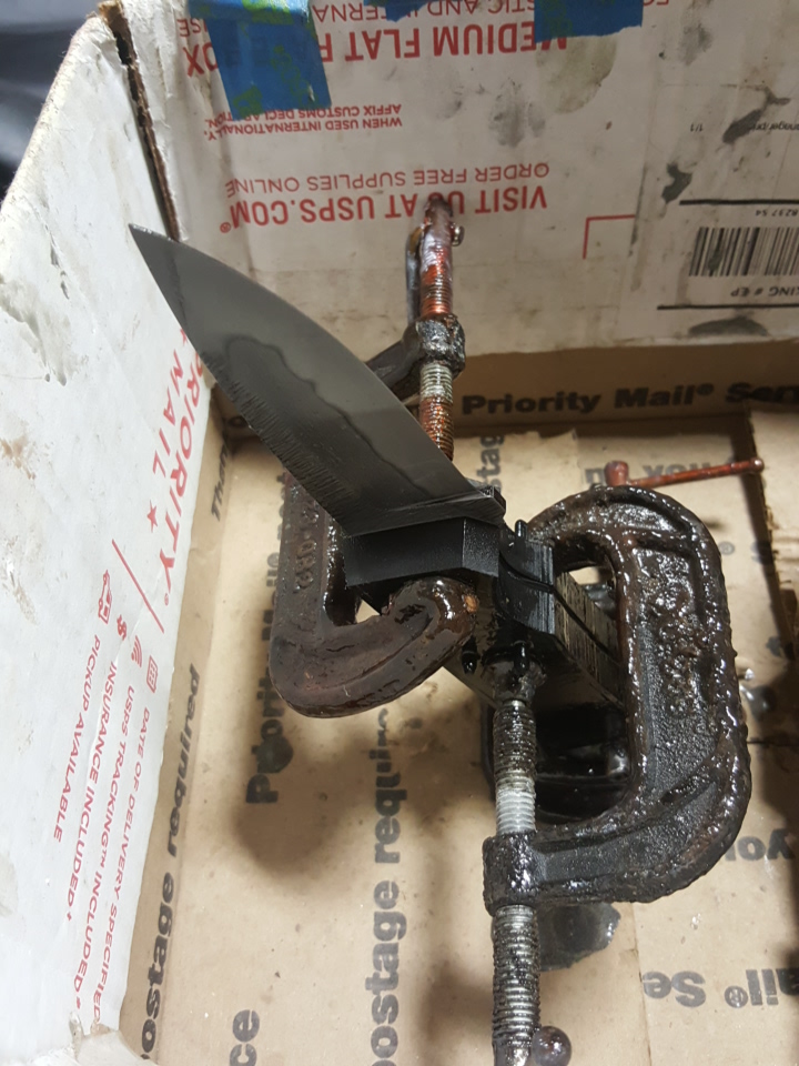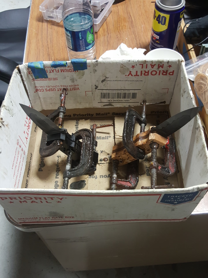 I started my weekend Heat Treating W2. It had been awhile since the last time I attempeted Hamon. I have decided to dive back into it and I am pleased with the results. Peter (Prom52) stopped by that morning to chat and have lunch and he was able to snap a few pictures while I quenched.