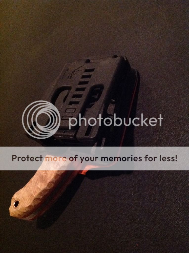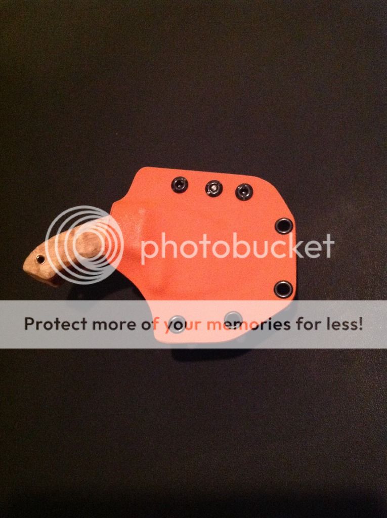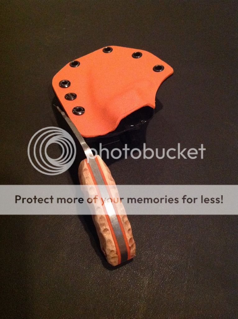The knife comes with a two tone (orange and black) kydex sheath that includes a large Tek-lok set up for right hip vertical carry.