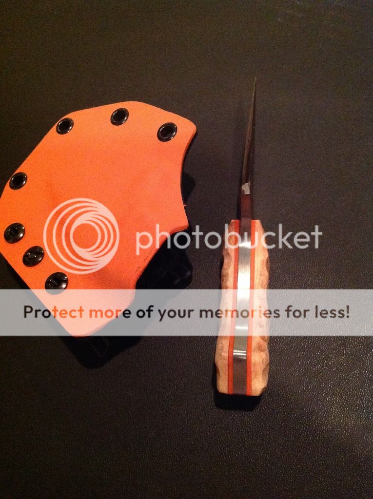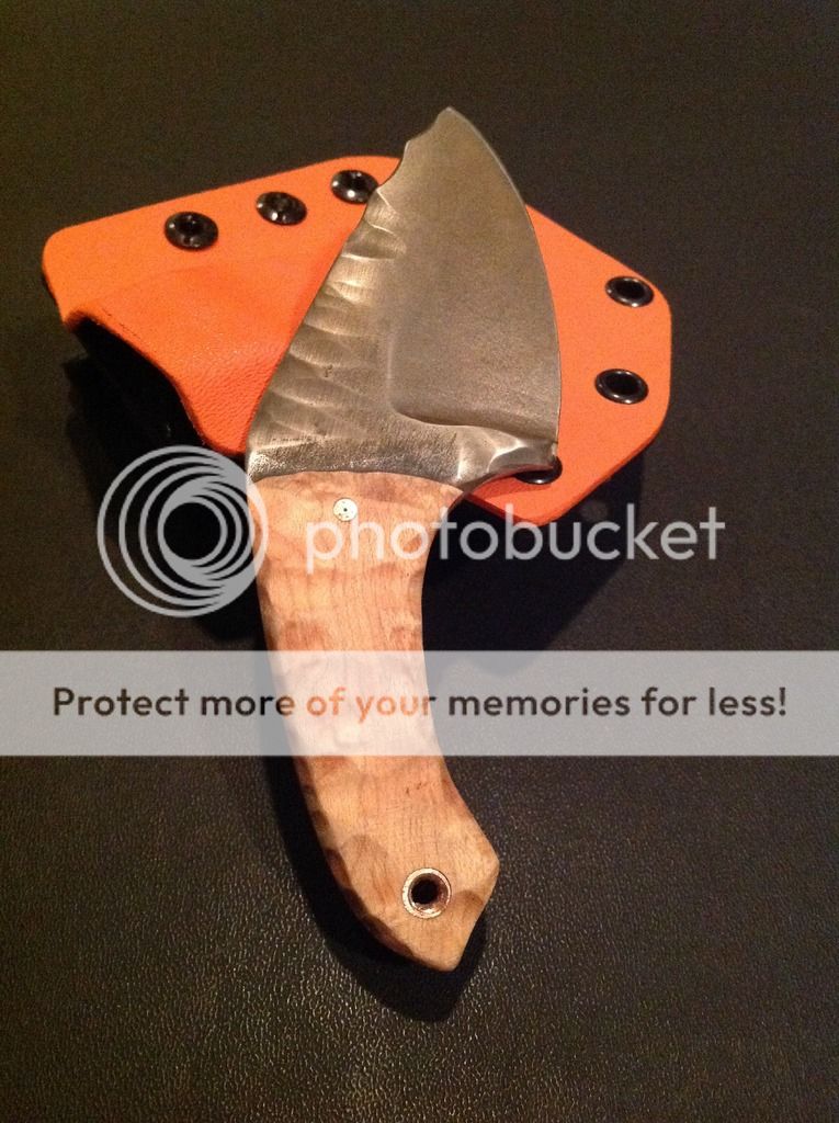 The handles are kiln dried Birdseye maple with orange liners. The handles are epoxied and have a decorative copper pin and a copper lanyard tube. The maple handles are also rock carved and then treated with several coats of orange oil and wax.