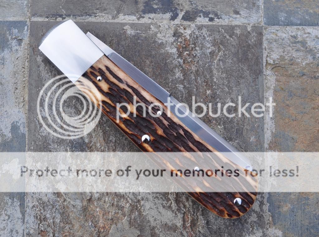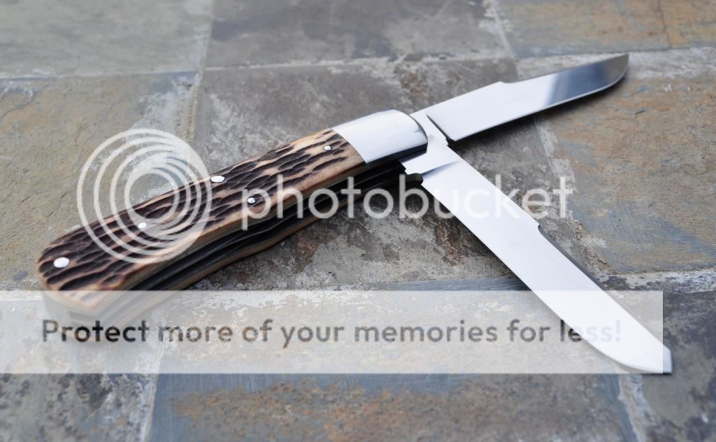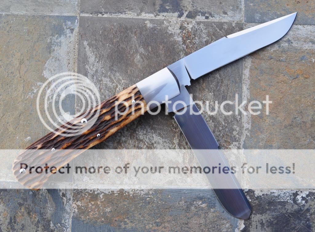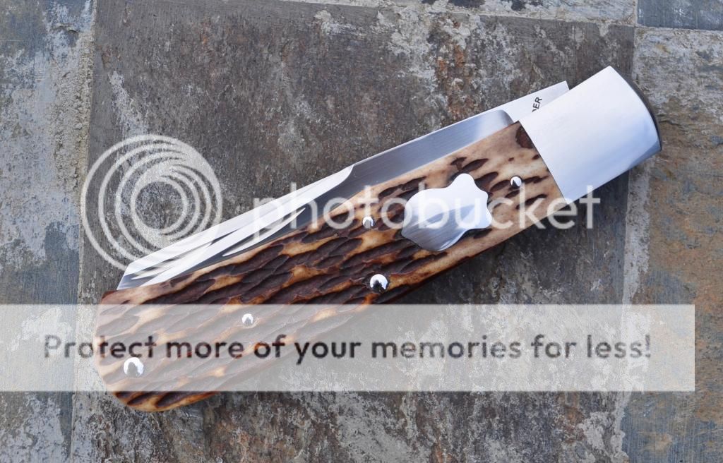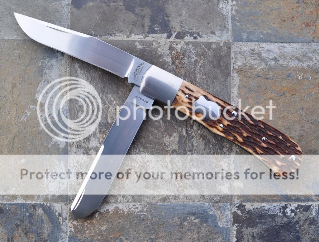 I am in the very early stages of retirement planning and am selling off most of my knives. I have a Tom Overeynder Model 20 Trapper that is just fantastic. I am the original and only owner of the knife and ordered it directly from Tom. It is in 100% mint condition. It has never been carried or used and has been stored in my safe. It has 416 stainless steel bolsters, pins and shield; old Remington bone scales; 3-3/8" Carpenter CTS-XHP SS clip & skinner blades; 4-1/8" closed; 7-12" OAL. The price is $1.800.00 and includes USPS Priority Mail insured shipping with delivery confirmation within the USA. I can ship internationally, but the buyer would have to assume all risks for loss, seizure, etc. Also, we will have to work out the extra shipping costs. For payment, I can take USPS money orders and PayPal (add 3.5% to cover the PayPal fees). Here are some pictures taken today: