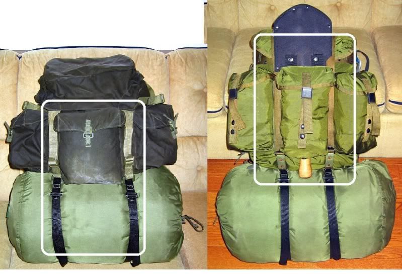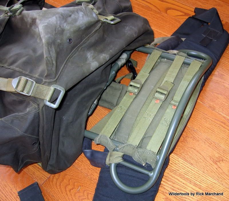 After I got home from my last trip.... I decided to piece together another ruck. I used a custom made 64 pattern lightweight jungle frame with a Canadian 82 pattern ruck bag. The Canadian bag is shorter but wider than the ALICE allowing my sleepgear to ride completely on the frame. I riged a better hip belt for increased comfort.