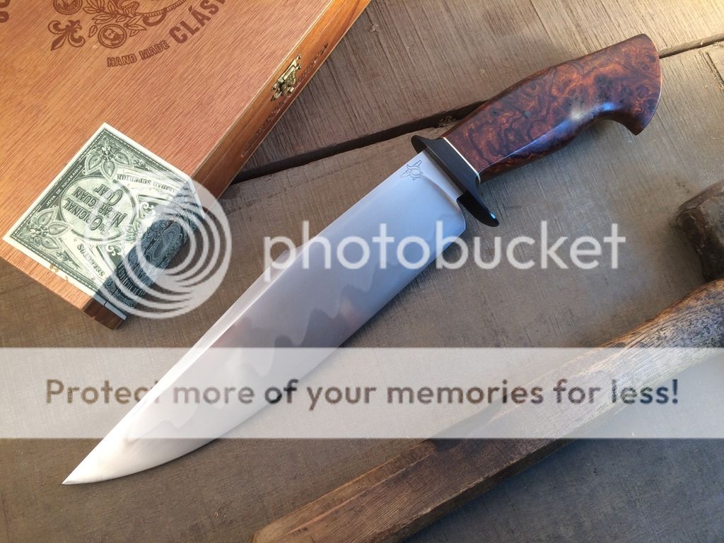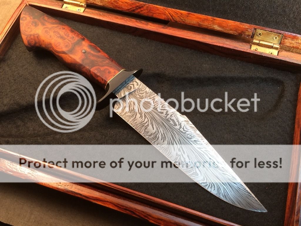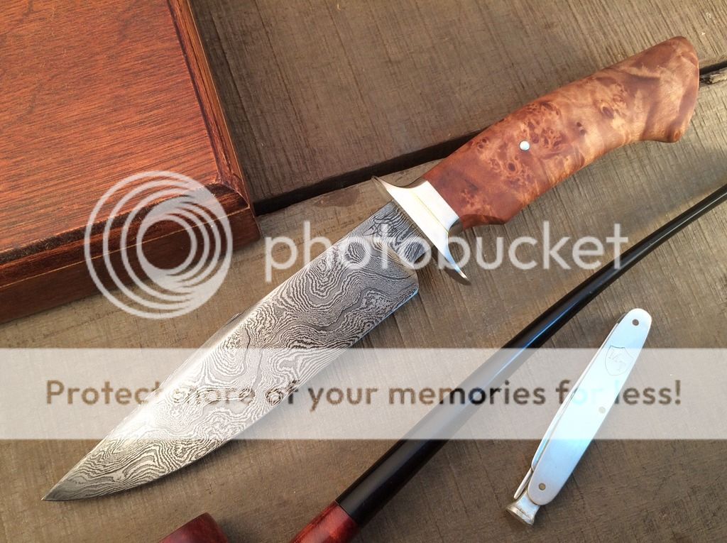A Gentleman's Bowie with Maple Burl handle. 6" damascus blade, stainless guard and 4.5" Oregon maple burl handle.