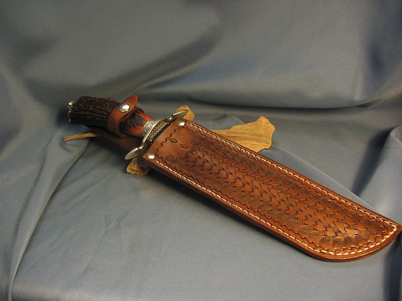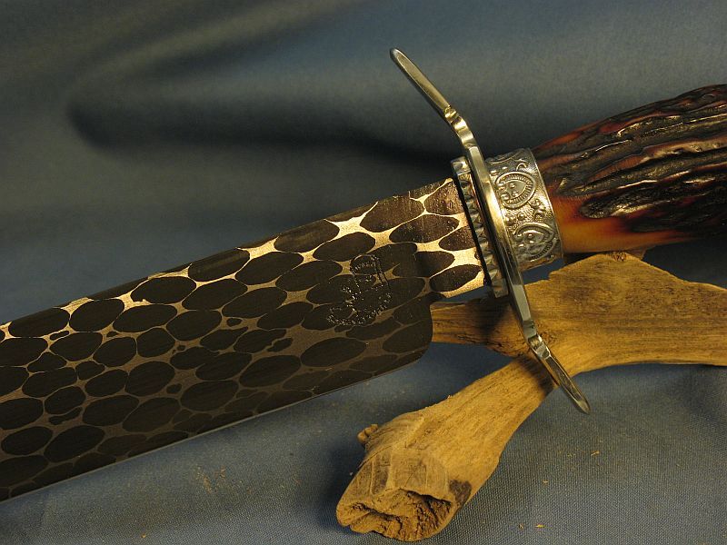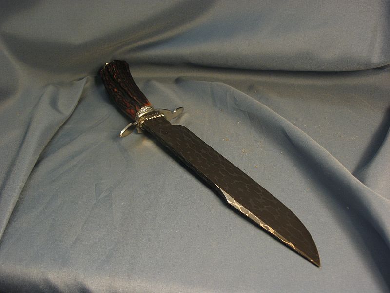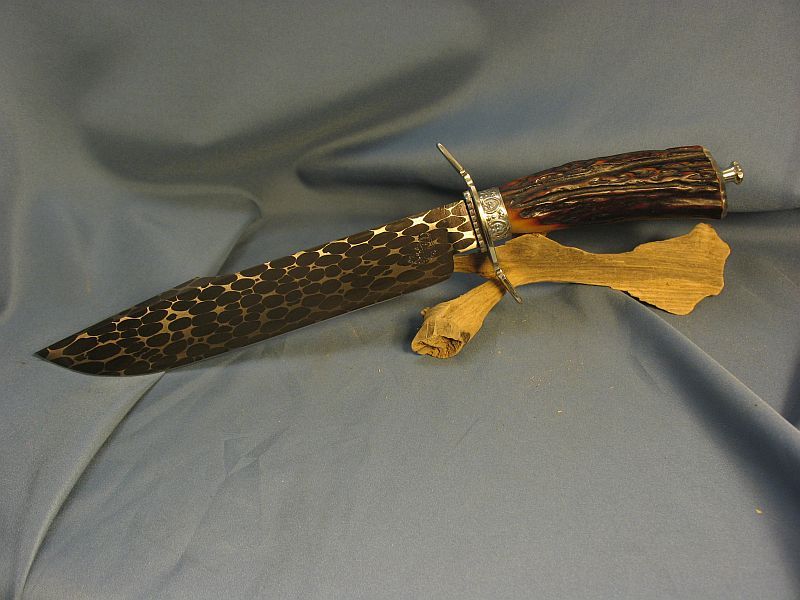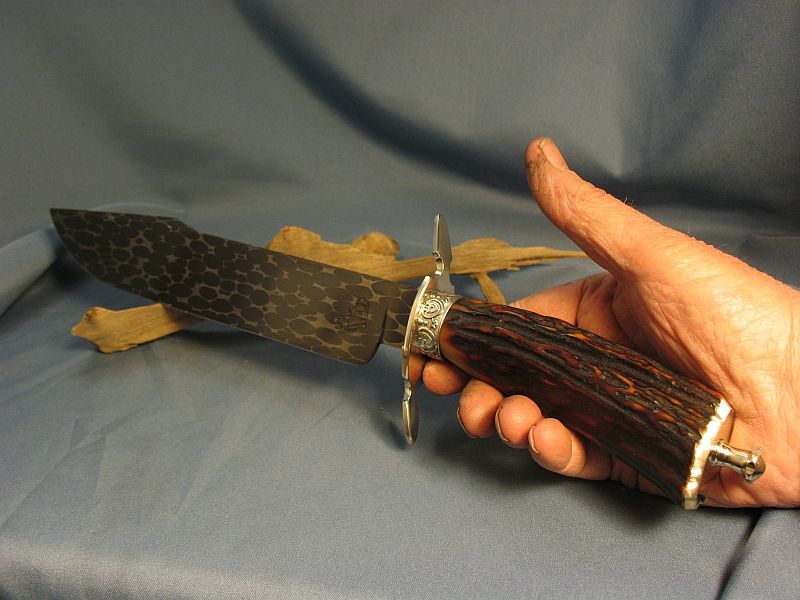 Here is a neat one that I just completed. Guard and fittings are nickel silver with a fine cut of stag that was amber dyed by Culpeppers. If you have never seen Culpeppers amber dyed stag it adds a whole new dimension in stag. Is good for right or left hand. Well balanced. I made the snakeskin damascus out of 52100 ball bearings and 4800KC steel. All the other damascus like this has been with small balls. Hell of an edge holder. Blade has a false edge and has a length of 9 1/4 inches and overall length is 14 3/4 inches and is 1/4 inch thick at guard. Comes with sheath. I would like 325.00 and 12.00 for priority mail in USA address (out of country please e-mail for price. Will be at my cost). My paypal is dangraves4923@earthlink.net