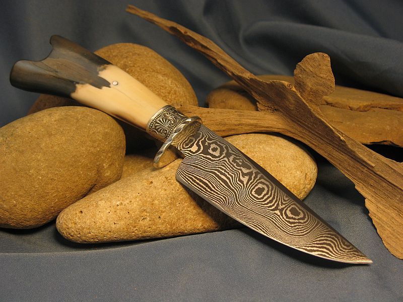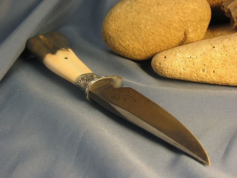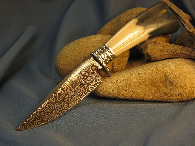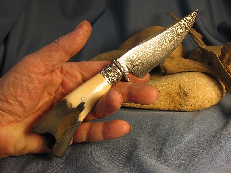This is one I just completed of Fossil Walrus ivory , nickel silver, sterling silver ferrule and my Damascus of 1084 fine grain and 15n20. The handle is a nice tusk tip with natural end as it came out of the ground. SHARP! Blade length is 4 1/8 inches and overall length is 8 1/8 inches. Nice leather belt sheath included. Any questions please ask. "SOLD" and free priority mail in USA. My e-mail and paypal is dangraves4923@earthlink.net And Yes, I Hope you like it as much as I enjoyed making it.
