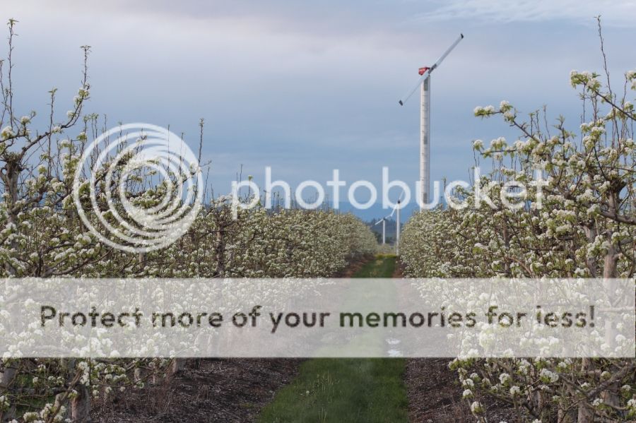I thought these were wind generators but while camping in the yard with my son a while back, I woke up to what sounded like we were being invaded by helicopters. Turns out they're giant fans to move lots of air to protect the trees, fruit and buds from frost.