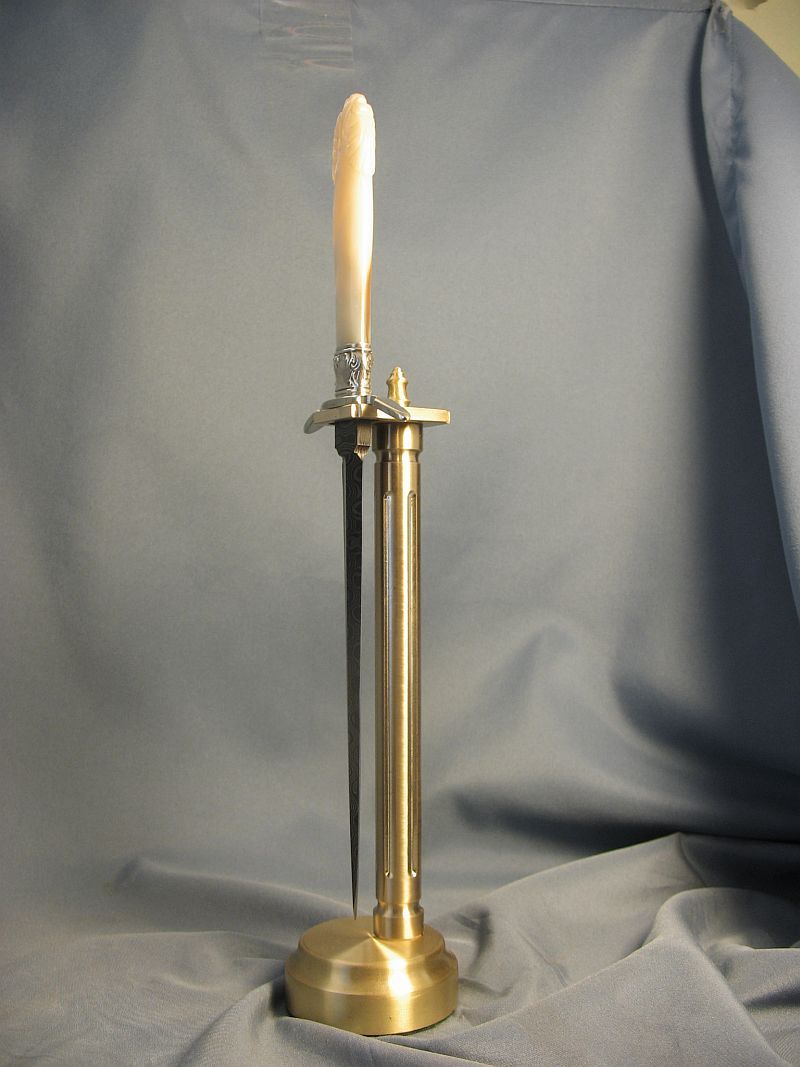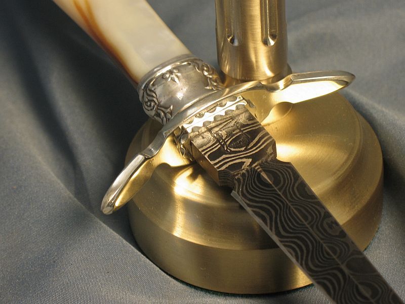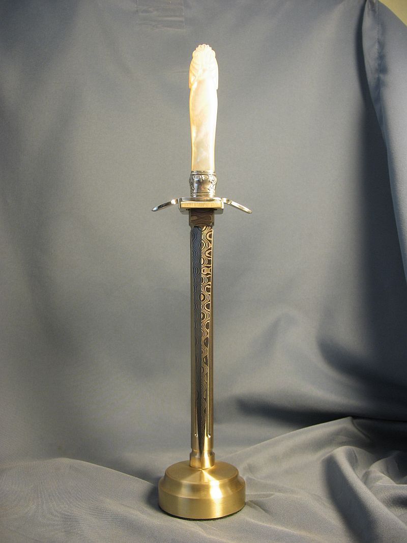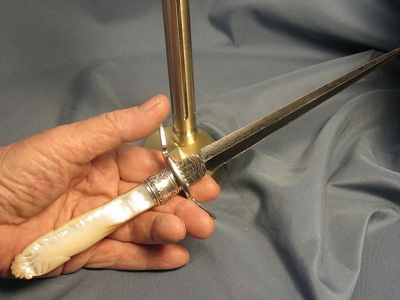 Here is a another one that I just completed. A rare one for me. Fittings are nickel silver and sterling ferrule and carved mother of pearl. I made the Ladder pattern Damascus out of 1080 and 15n20 steel so the "O's" would be centered in the middle of the blade. Heat treated and hardened. Blade length is 7 1/4 inches and overall length is 11 7/8 inches and is sharp with a wicked point. My hardest grind.