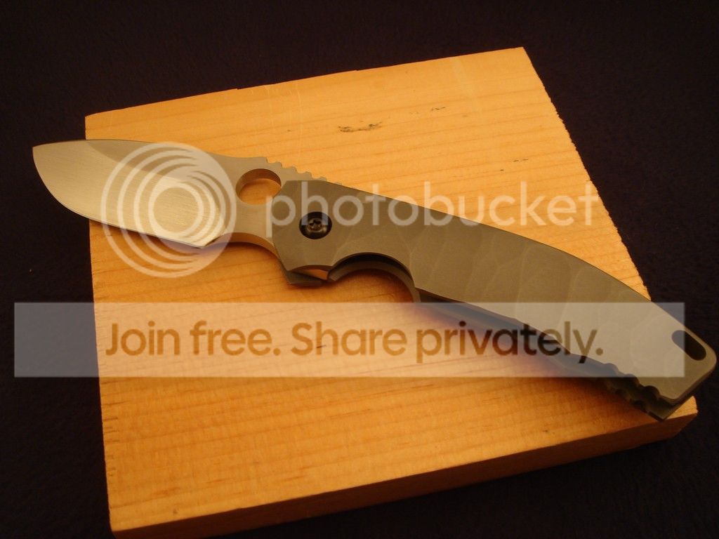 For Sale: This is a Peter Rassenti Alpha Integral Framelock. One-piece titanium frame is sculpted on both sides, as is the clip. This is a beautifully made knife, and a fancy piece of machining work. With a nice-gripping spydiehole and a firm detente like this has, the thing just flies open. Definitely the most reassuring lockup sound I've ever heard, rather like the gate on my F150 whomping shut. Not sure what he uses for bearing, but it's smooth, smooth, smooth, like a slide covered in Crisco.