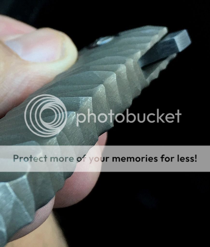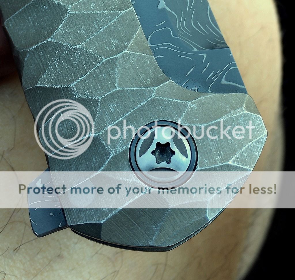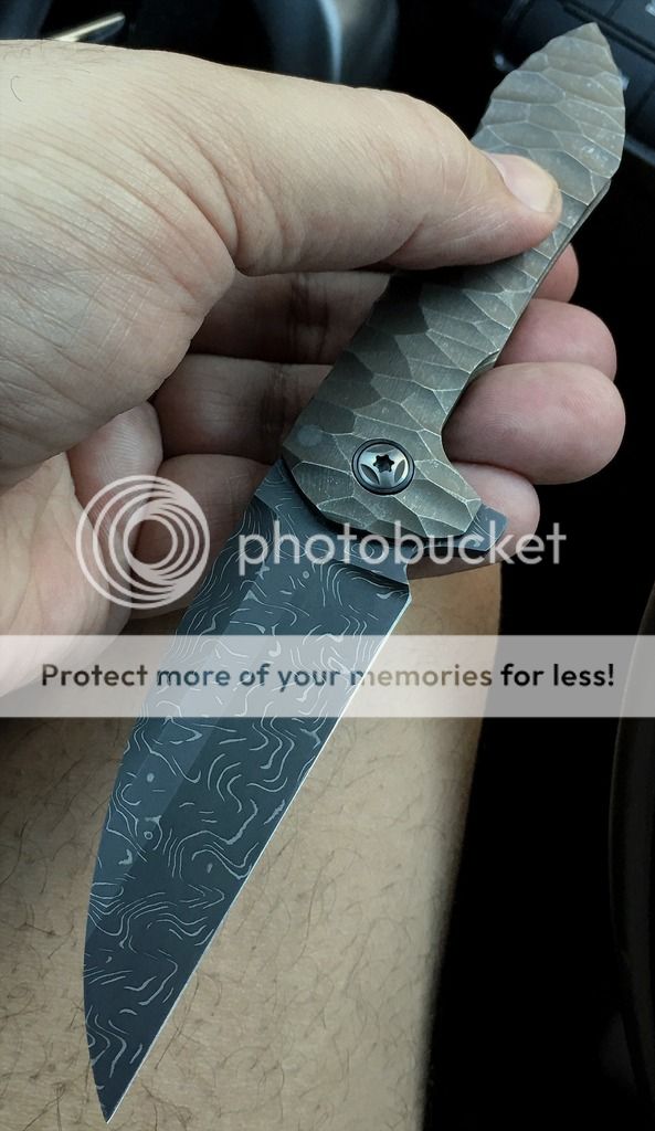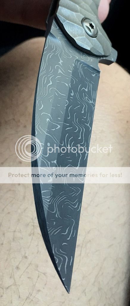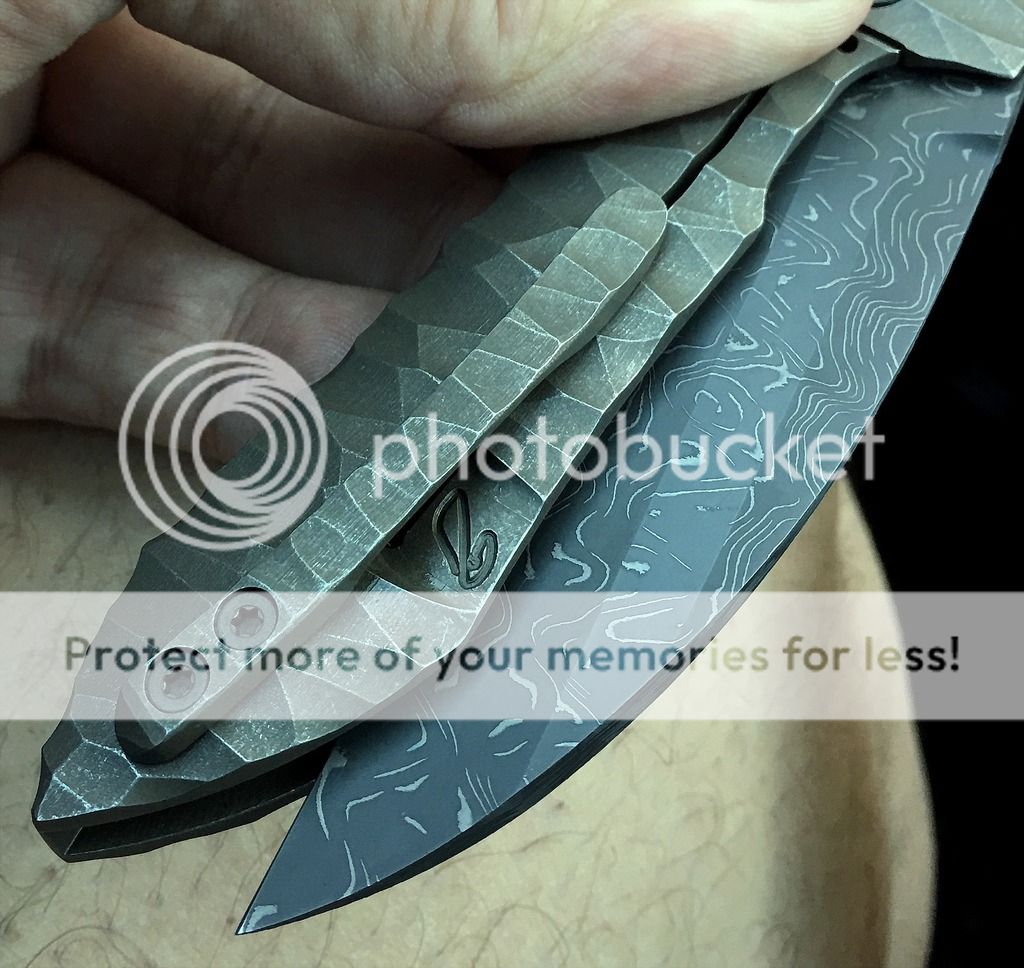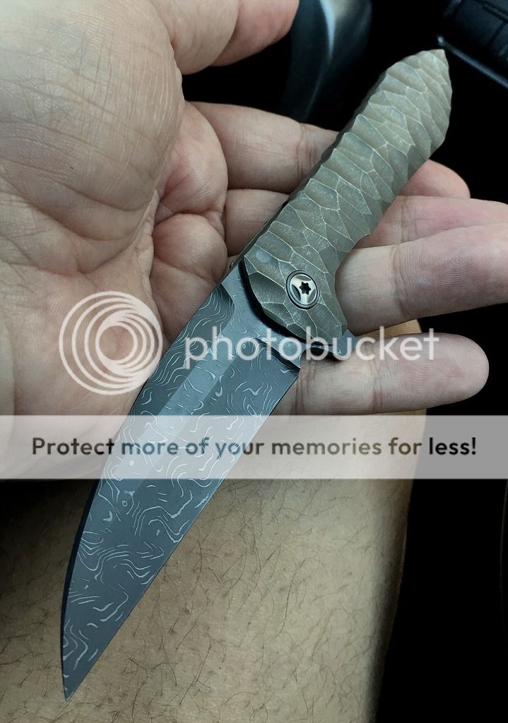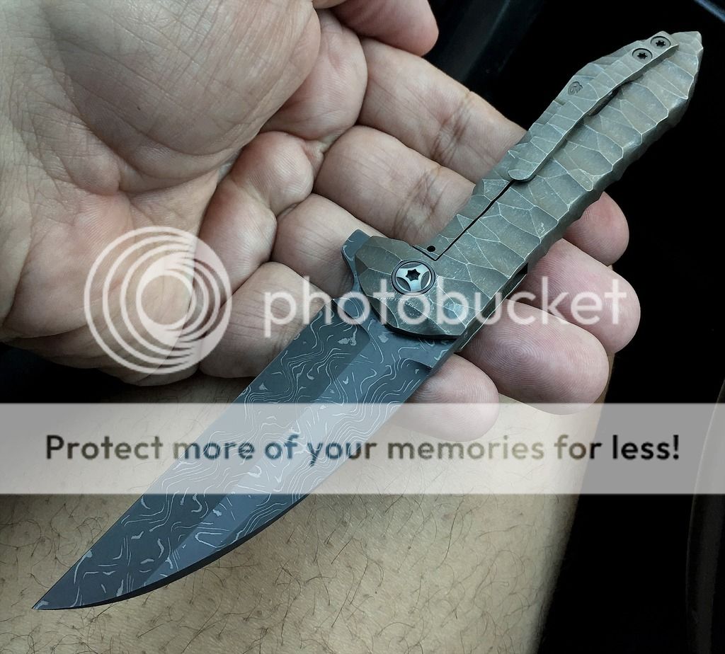 Blade is a beautifully ground, somewhat complex wharncliff, of Chad Nichols high contrast Damascus. The pivots have polished Zirconium collars. The handle has a flint knapped distressed stone type carving treatment, with a subtle greenish color. And again, this is a true integral, milled from one bar of titanium.