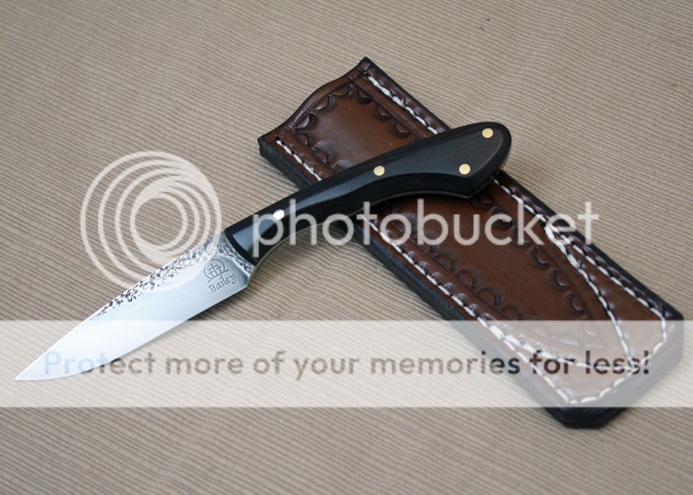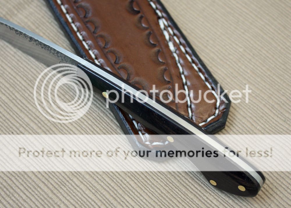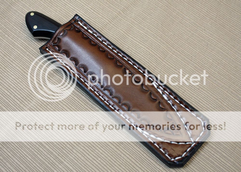 The sheath is my pocket fixed blade design. It is made to slip in the pocket like a cell phone. It is made from leather from Wickett and Craig. It slips in nicely and holds securely.