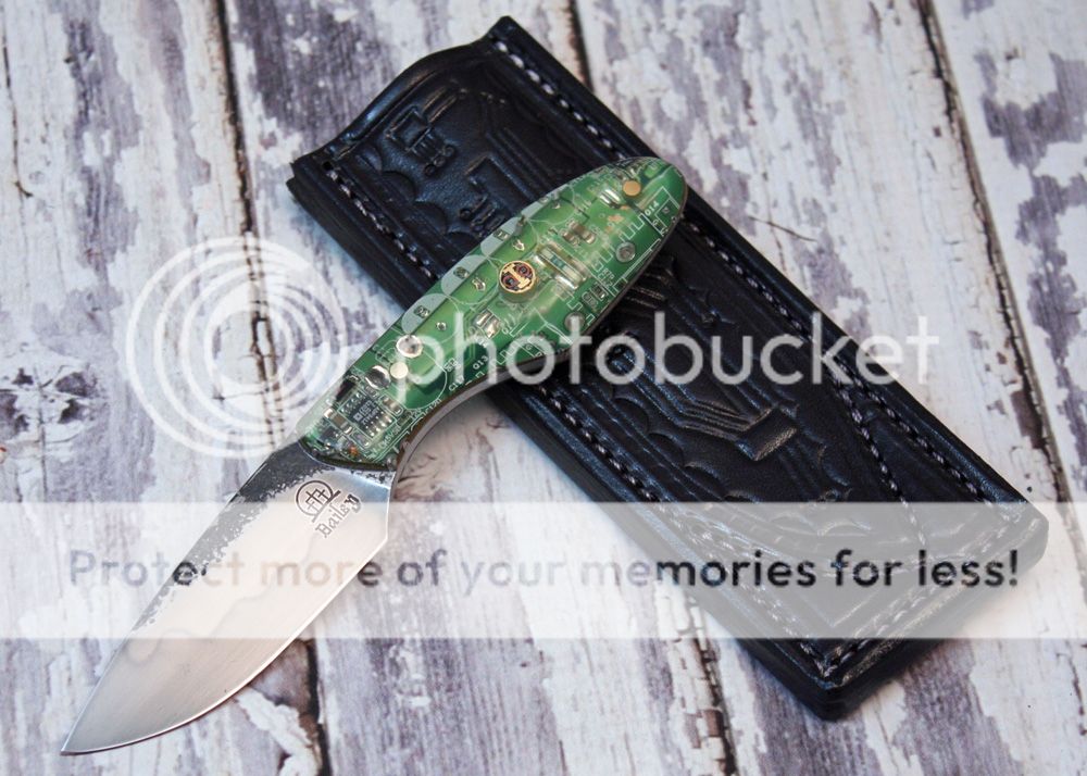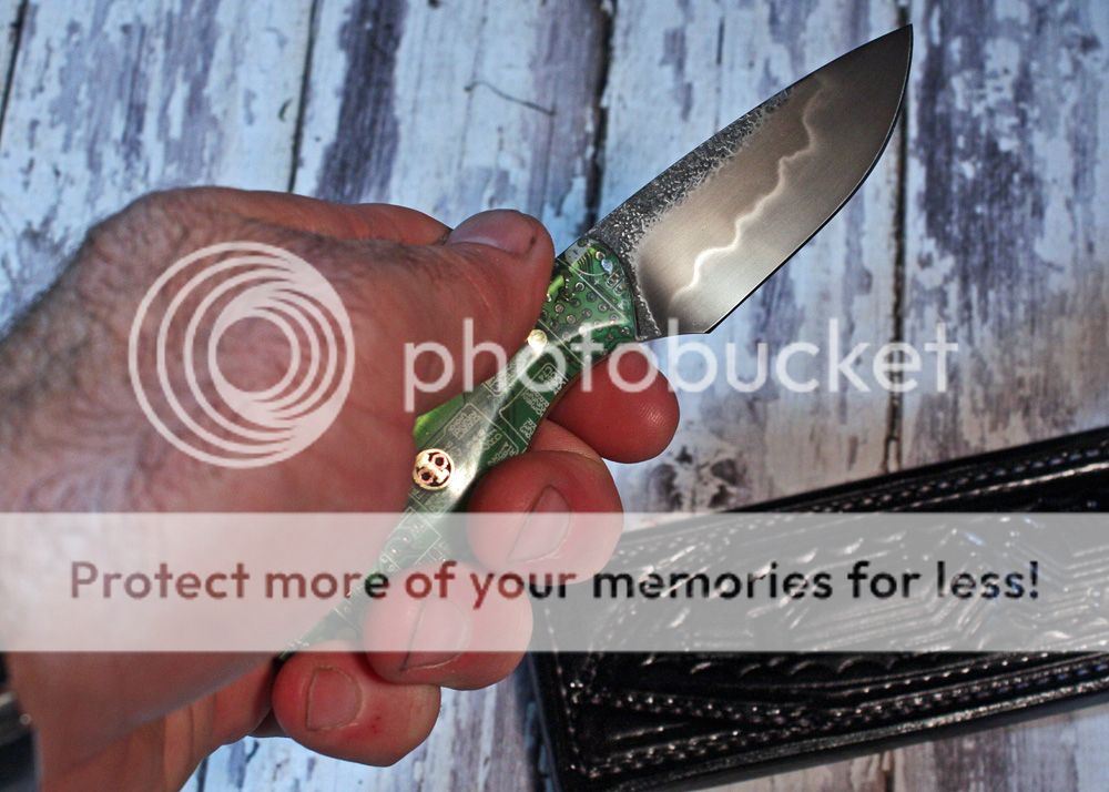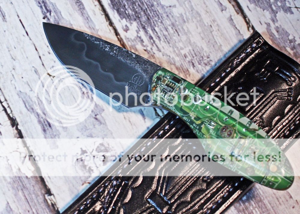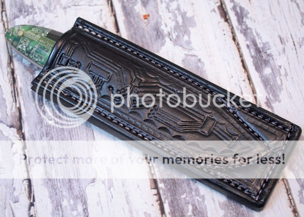 The sheath is 7-8oz hand tooled leather from Wickett and Craig. It is made to slip in the pocket like a cell phone. I designed it to look like the motherboard.