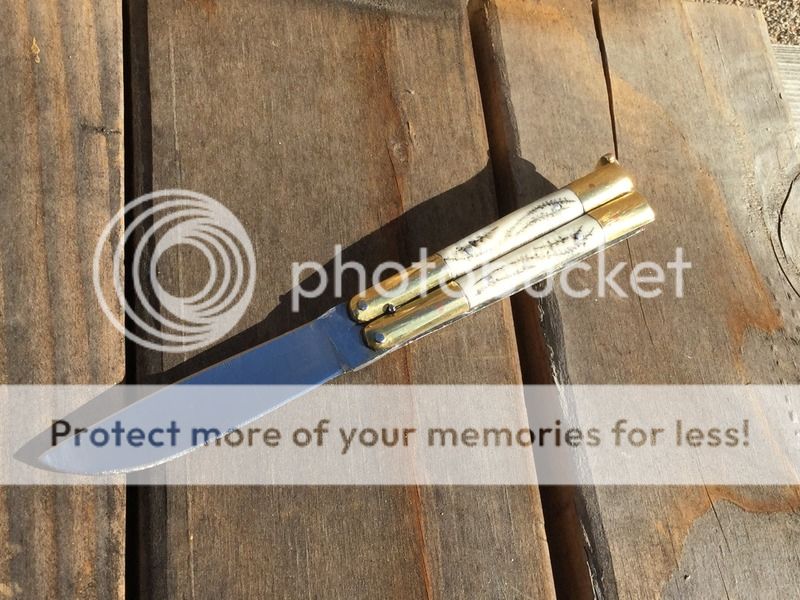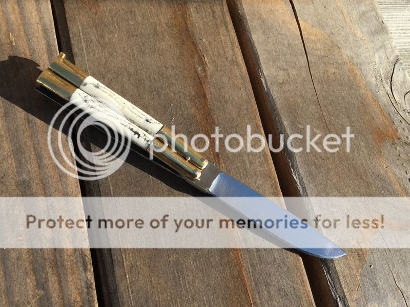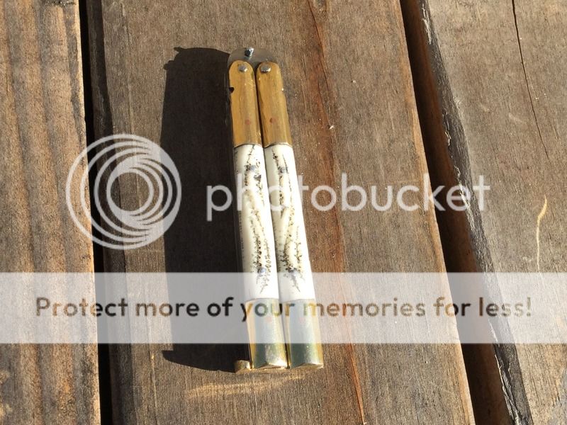 Handmade Philippine butterfly knife in near mint condition. This pocket size knife is tight open and closed, it's not a flipper but I'm sure if you want to you could loosen it up. The knife is 3 1/2" closed and 6 1/8" open, the handle inserts are bone with a stag type of jigging. $75 shipped. For some reason I can't upload any pics, if you are interested I can send you the pics. I will try again latter.