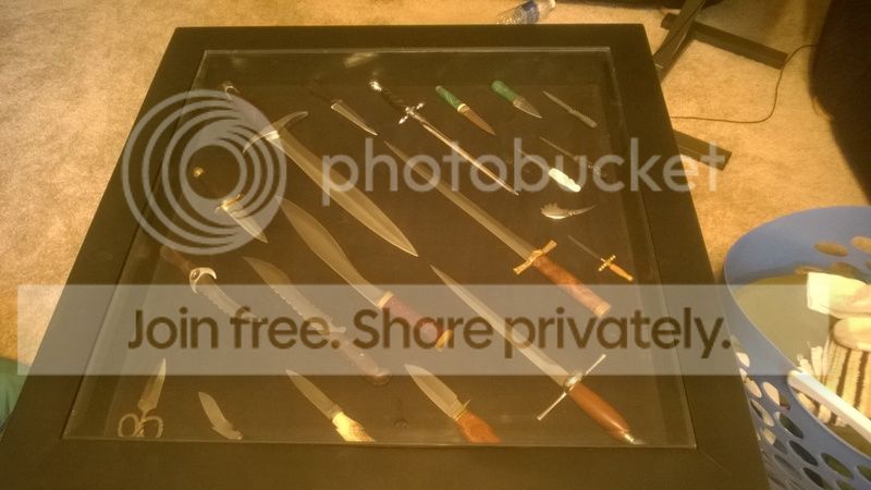 I don't display my knives. The ones that I might carry or use are generally either in my pocket or on a book shelf where I can find it. The others are stored in plastic cases and get looked at from time to time. The oldest knives that I have no interest in or seldom have an interest in are in a big plastic tub with lid (boxes included).