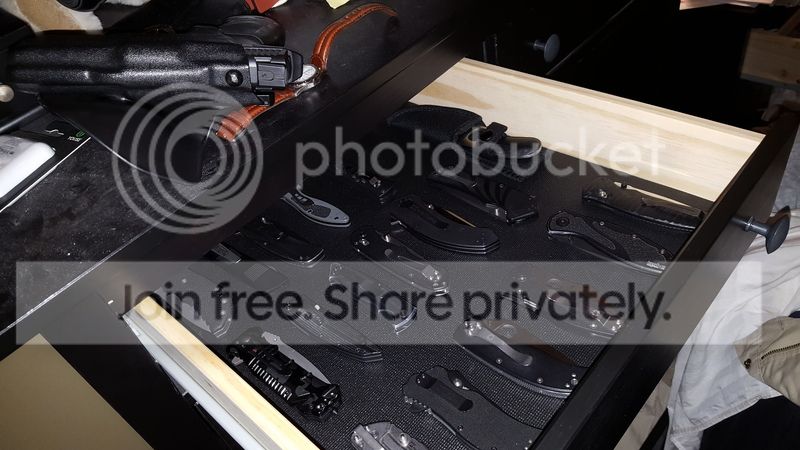 Most of the rest of my ~400 folders are in various knife bags and Spyderpacs below. I keep tools and sharpening equipment in the drawers. All in all, the plastic storage drawers work pretty well, but they're already bowing under the weight of the knives. I'd like to replace it with metal or wood someday.
