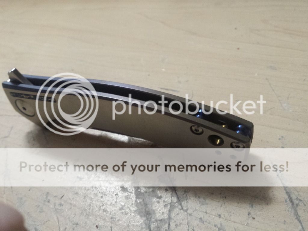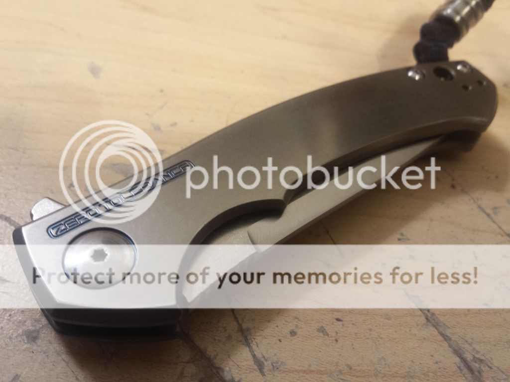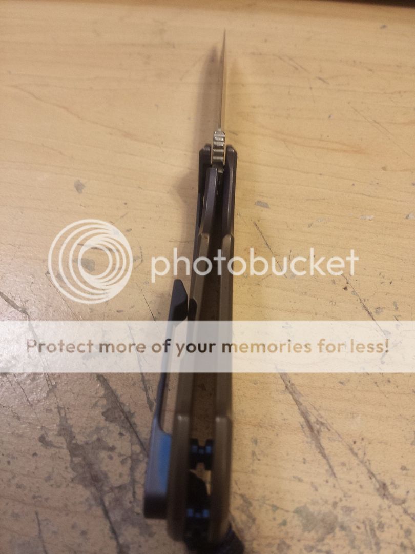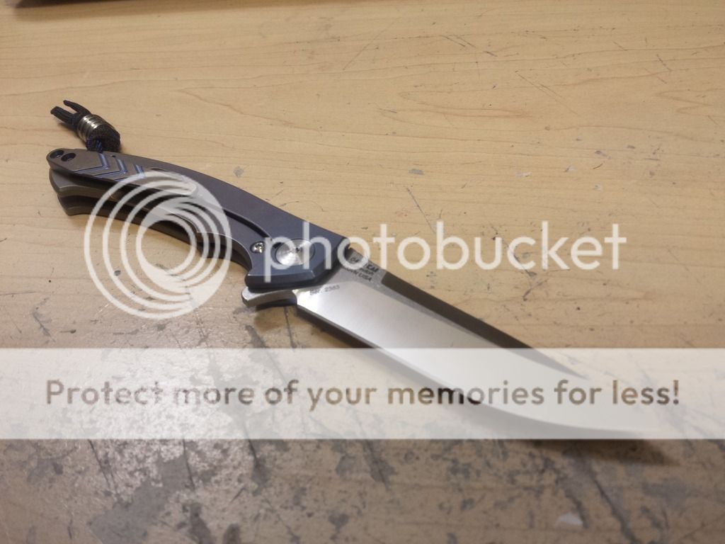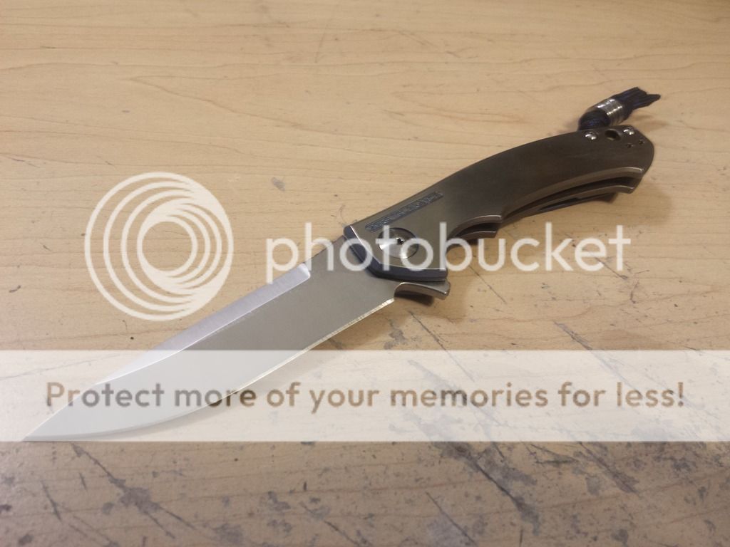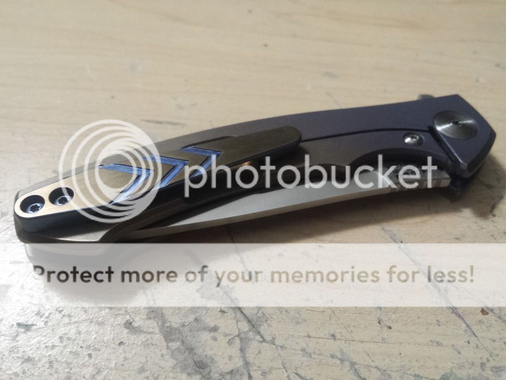 Pimped ZT 0450. Anodized blue to bronze fade lock side and edges, polished presentation side with ano inlaid to the writing. Bronze and blue titanium ano pocket clip, blue titanium standoffs. Beautiful knife. Bought the knife, already anodized, on the forum for $145, paid $47 for the pocket clip, and $22 for the blue standoffs. I am asking $200. I will consider a trade for a plain edge Benchmade 275 Adamas(+ a little boot), a Benchmade 810 Contego(+ a little boot), or a Spyderco Domino.
