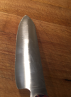 The knife pictured below (still in progress) is a first attempt to really pull together my individual learnings so far. A Santoku, AEBL, stock thickness is 0.095". My INTENT was to grind the secondary bevel to a width of 1.14" while maintaining a clean and consistent Shinogi along the length of the blade (including uniform distance from the upswept distal end of the edge), and maintaining reasonable symmetry between the sides. Per the trigonometry, this should give a secondary bevel angle of 2.4 degrees per side) Please reference the pictures below (grind has been taken to 320 grit (Trizact A65) and then scotchbright), thickness behind edge is ~0.01":
