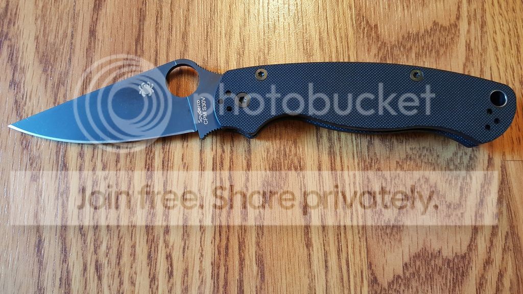 Spyderco Paramilitary 2, s30v, black/black. Light user in very good condition with excellent F&F -- well centered, no blade play, super smooth, and a free dropper. Locks up about 45%. Faint scratches/marks in DLC on blade -- these are about the only signs of wear on the knife. I've had numerous PM2s over the last few years, and this one has the best action and F&F of any I've had. Box and paperwork included. See pics below.