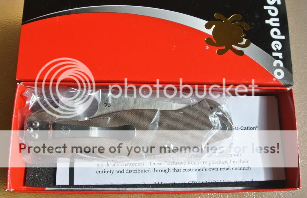 Brand new in package, purchased from Spyderco dealer. This is a catch and release as I bought a 2nd Brown PM2 thinking that the first dealer's back order would never be filled. Took out for initial inspection and pictures, flipped open once to check action, put back in the box and has been in the safe since. This is an excellent PM2 that is centered, has smooth action and great lockup.