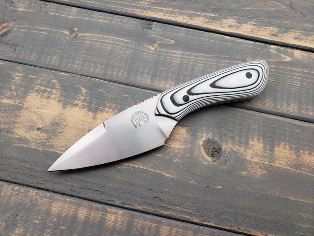 Forged from 80CrV2, this drop point neck/pocket knife is 6 7/8" overall with a 3 3/16" cutting edge. It features light jimping on the spine, an unsharpened swedge, and has a hand sanded, scotchbrite finish. The handle features white & black G10, with black G10 pins. The knife comes with a custom Kydex sheath complete with a 30" ball chain and a 2.2" Ulti clip for pocket use. The price is $125 shipped through PPGS.
