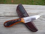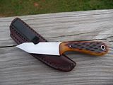 I made one of these little chisel ground tantos with red jigged bone scales for myself about a month ago and then made the mistake of showing it to a couple guys. The blade is roughly 2-1/2" long with a 5-1/2" overall length. This one has amber jigged bone scales and a lanyard hole per my buddy's request. This is only the fifth knife I have completed and I still basically have no clue. I was asked for a satin finish so I sanded it parallel to the spine with 400 grit and then gave it a light rubbing with white compound. The pocket sheath works just like a clip on a pocket knife but I am little worried that the knife will come out too easily after the leather breaks in. I have been working with files and an old 6x48 belt sander but I am looking forward to upgrading in the near future. Special thanks to BarryC for taking time out of his Saturday to help me properly heat treat several 1095 blades. This is one of them.