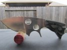 Very Sharp. This knife is robust, tough and will take on any challenge, tactical, defense or tooling. The design is AWESOME, equal to a BUSSE, REEVE, or STRIDER and the way it is cut gives you a very ergonomic way to fit your hand and have your pinky rest on the extension. Top serrations are great for thumb leverage while slicing. I've never seen such a cool looking knife so had to get it. Now reducing my collection and decided to sell it for another treasured collector.