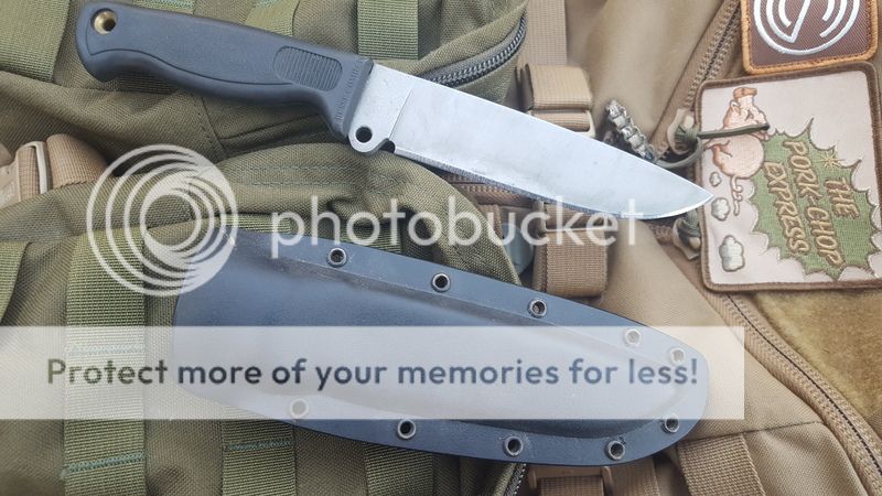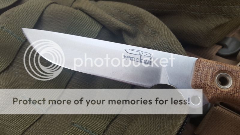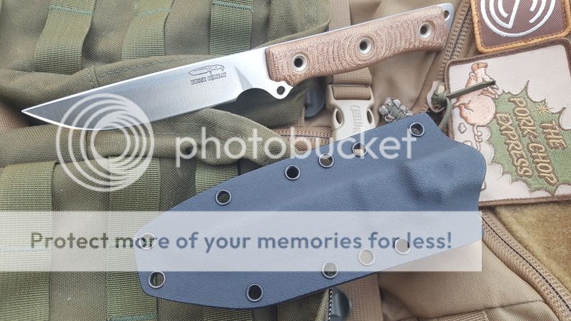 1) Unused Pork Shank, great knife, perfect size and feel. Only mark I can see is just a tiny faint hairline from the sheath. Kydex sheath fits perfectly, made by dericdesmond. .157" thick, 4 7/8" blade, tan canvas micarta.