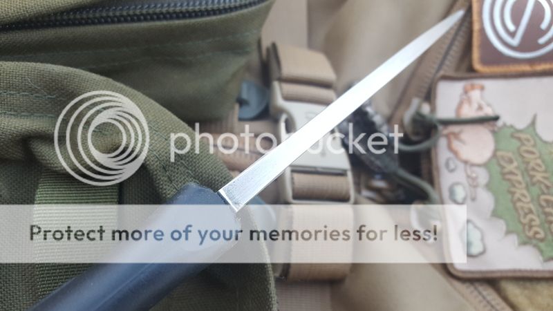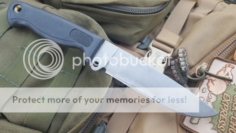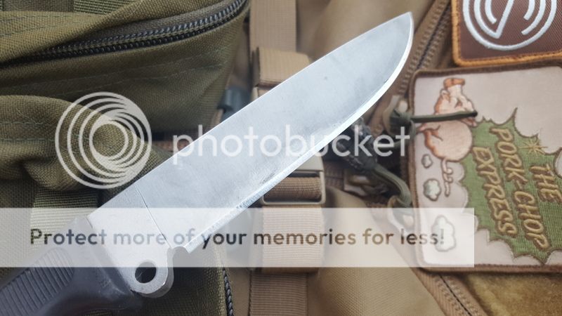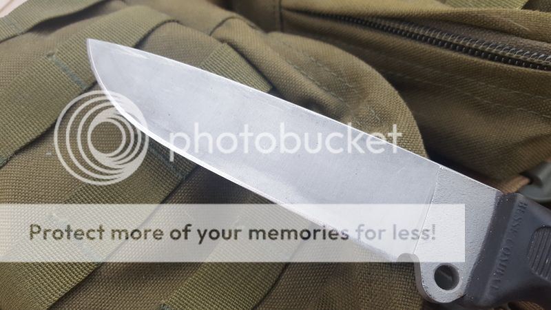 2) Basic 5, stripped, M-Infi (modified INFI), and asymetric edge. Another one of those great feeling, great sized Busses, and comes with an old school sheath. Coating has been stripped and the decarb left to create a dark ghetto satin. Edge is still pretty factory, I don't recall sharpening it, just a leather strop from time to time, not razor sharp but still very much usable. Has been used and some marks in the decarb has happened but it's a user with plenty of hand satin-ing to go. .26" thick before the plunge line but tapers very quick, 5.5" blade. Very light and handy camp knife or woods knife. Spine appears to have been polished a bit and a little bit of the handle was flared/smoothened for a thumb area.