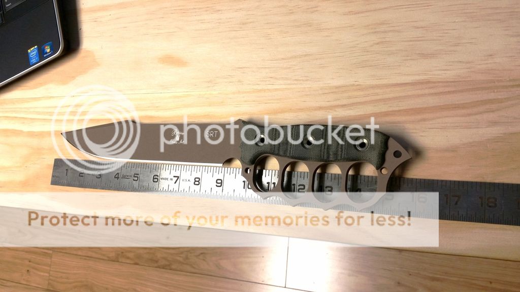 Parting with one of my grails. As the title states, this is a Busse Custom Shop Argonne Assault Special Response Team (AA SRT). Not many of these in public hands and they don't come up for sale often. I'm the second owner and the gentleman I got this from said he was on the SRT that received these straight from Jerry, but I can't confirm that (he did sound legit). I can tell you that this is one badass knife and it is in mint condition. Since I have little girl hands, it's a smidge too big to be comfortable for me. It needs a real man to handle it. Are you a real man? Probably not, but this knife will certainly make you feel like one. I bought a new house and as we all know that puts expenditures into perspective and I can't justify having this in the safe when it can help pay for a rototiller or a chipper that I'll use all the time. Good news is I have a 2007 Special Edition AA in the safe still, so I can get my AA fix anytime with that.