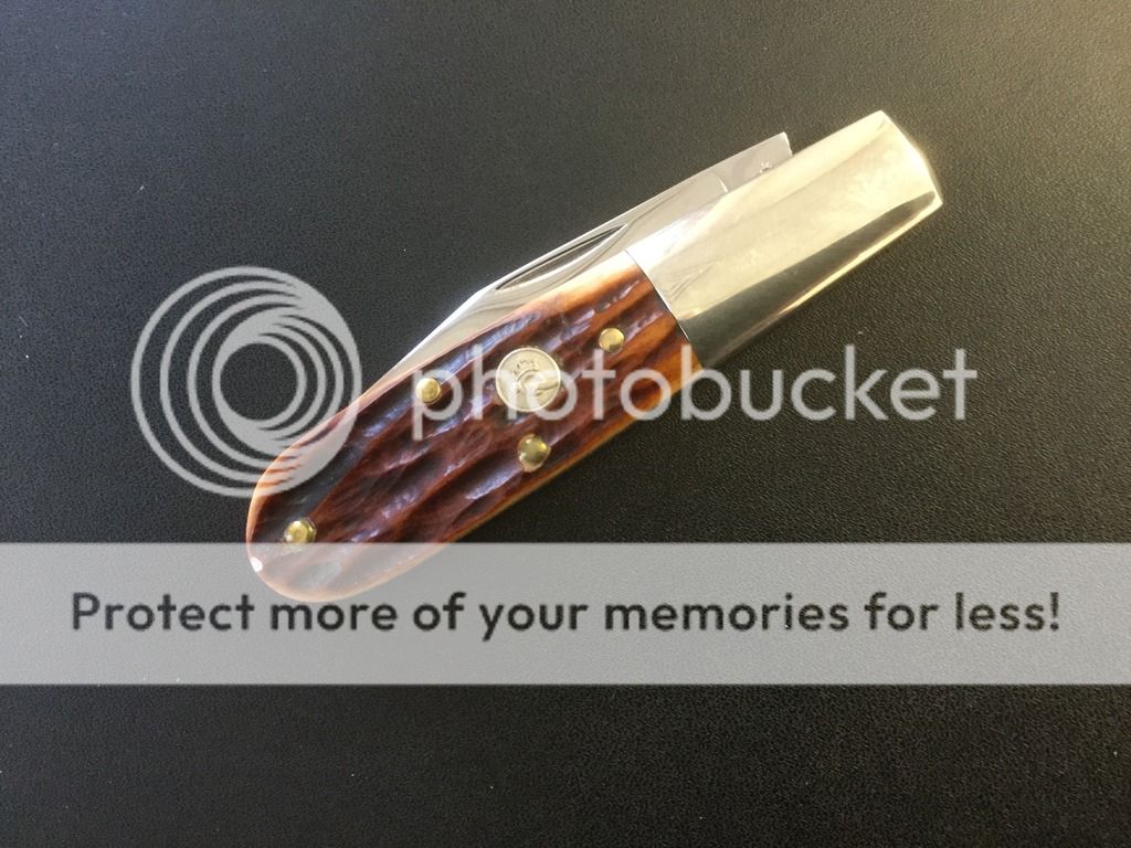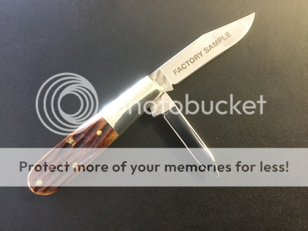 Up for grabs today is an interesting and unique 3.5" Barlow. As you can see from the photos, this was a Factory Sample put together from some parts. The shield is the Queen but note the tang stamp on the main blade (Col Coon). I picked this one up at a knife show and it does show a bit of wear on bolsters from bouncing around. I have not carried or used it but cannot vouch for its complete provenance. Appears to have been honed but blade looks to be complete and full. Very impressive walk and talk on this one. I have attempted to describe this as thoroughly as possible but don't hesitate to ask questions. $68 Now $58 Ships to your door, Priority Mail, US only.