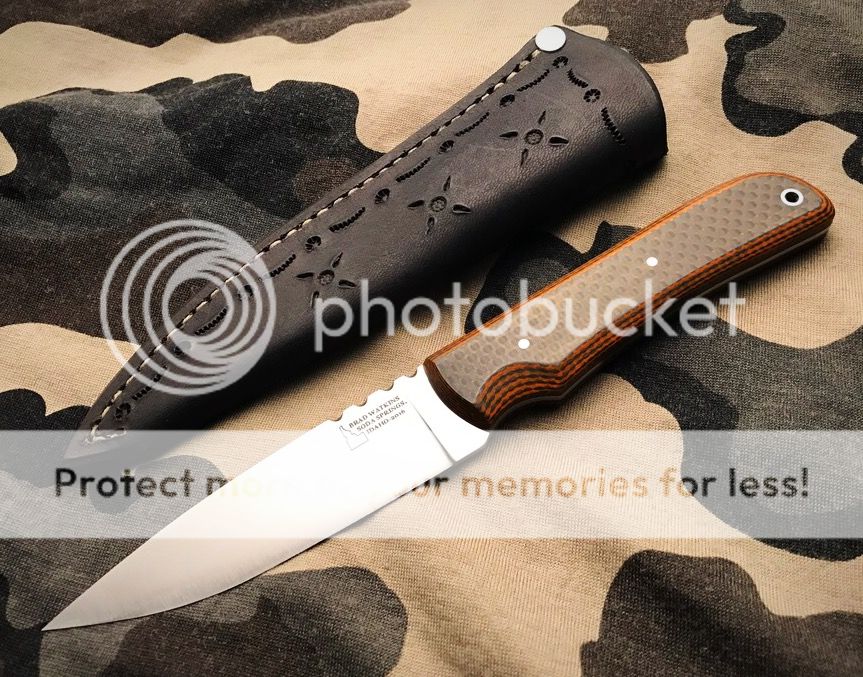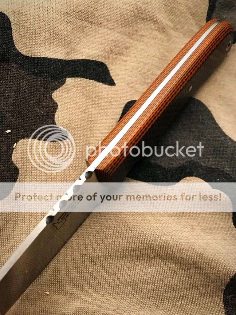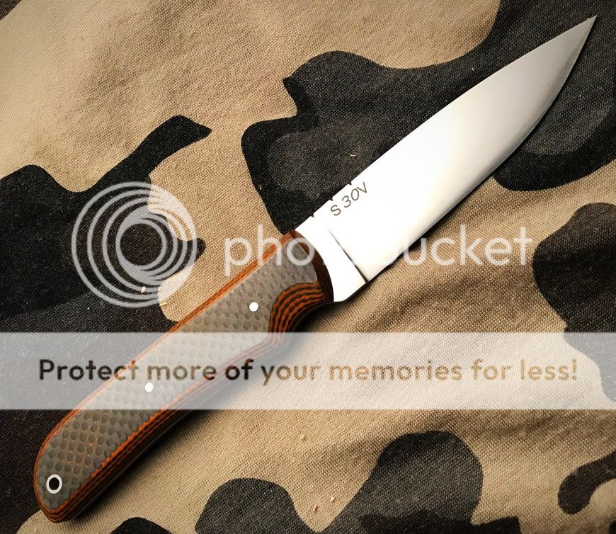 0.100" CPM S30V Steel, 62 RC, flat grind, tapered tang and file work on the blade, satin finish.