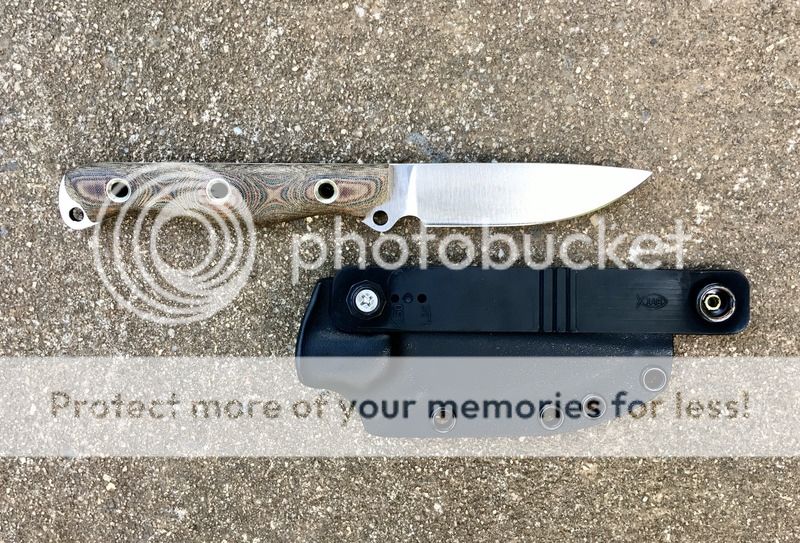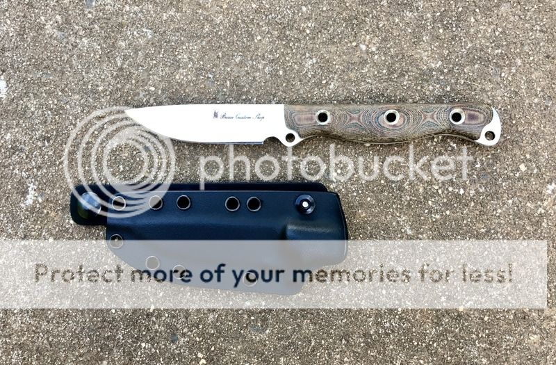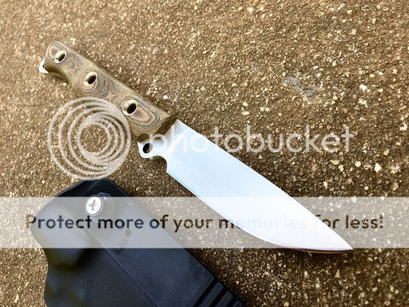 Next up is new and unused Busse Custom Shop Cultellus in Satin and TigerHide Micarta. There are a couple of very small marks that you can only see from a certain angle from going in and out of the sheath. They are hard to see. It comes with an Okuden Kydex sheath.