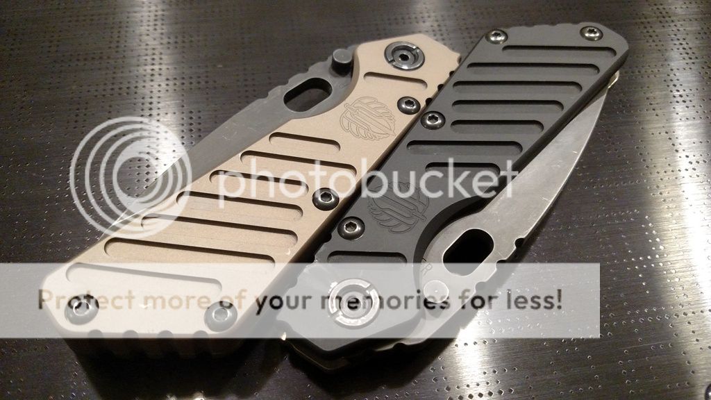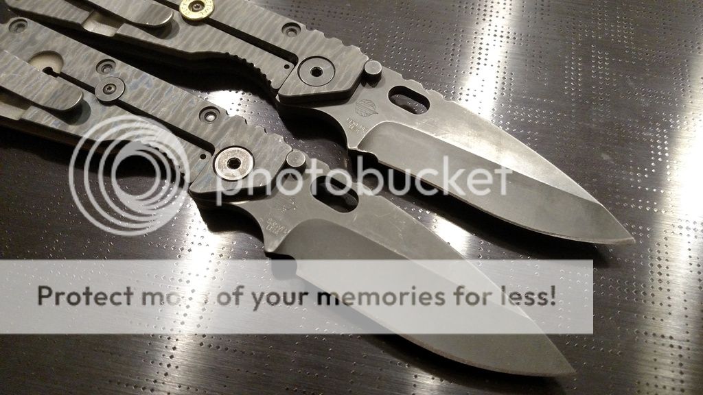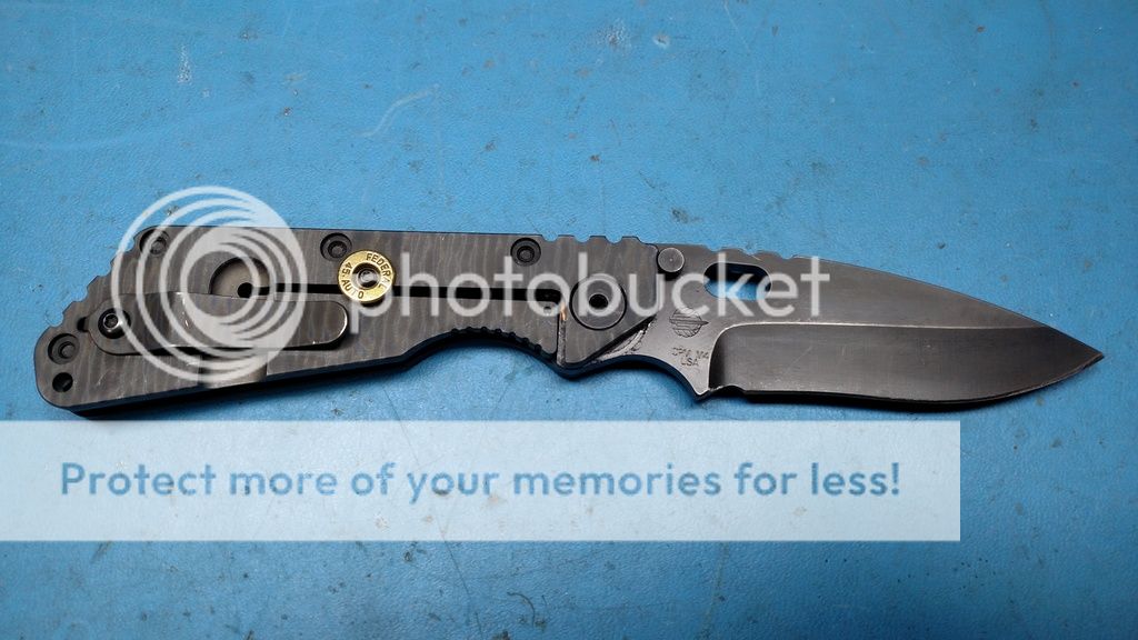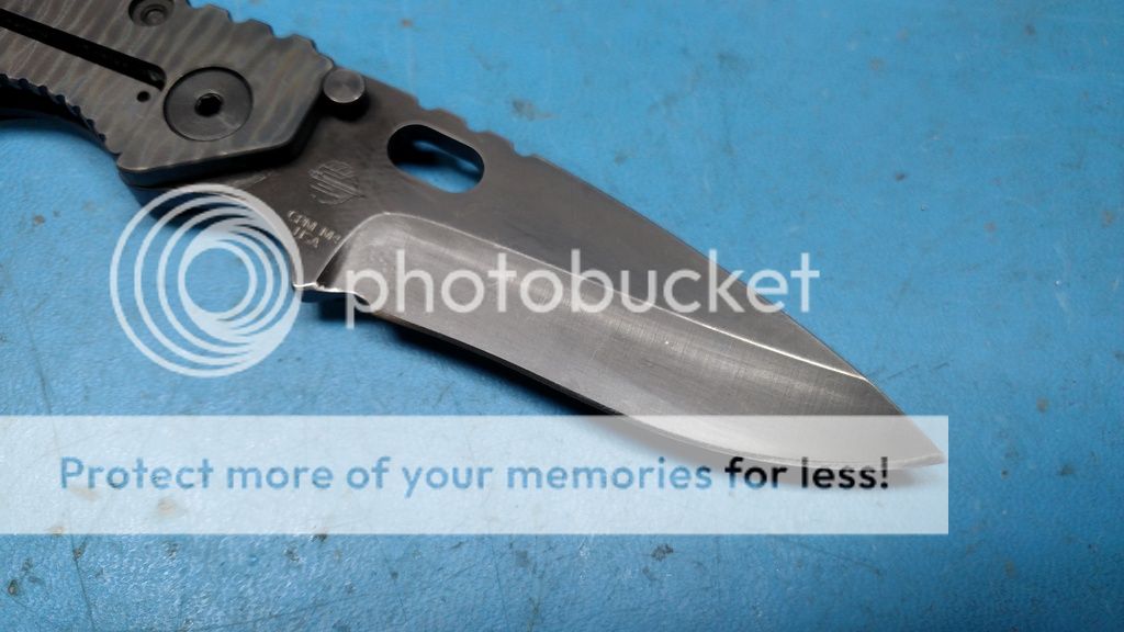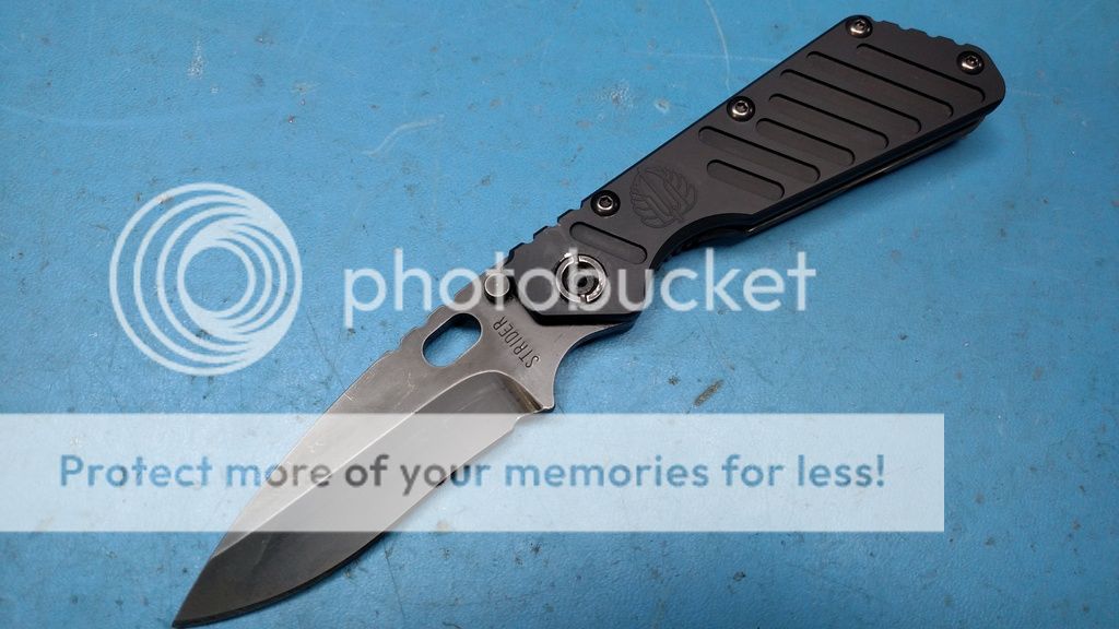 Black Aluminum SMF with CPM M4 blade!!! According to the gentleman I got it from, the previous owner dinged the blade at some point, so Strider fixed it by regrinding the blade to a recurve profile. Pictures seem to show more wear than is visible when just holding the knife, but it is a little more of a user than the first, in excellent condition however. Aluminum has a small scuff right next to the pivot screw that looks like the anodized finish was scuffed away, doesn't really go beyond that into the scale.