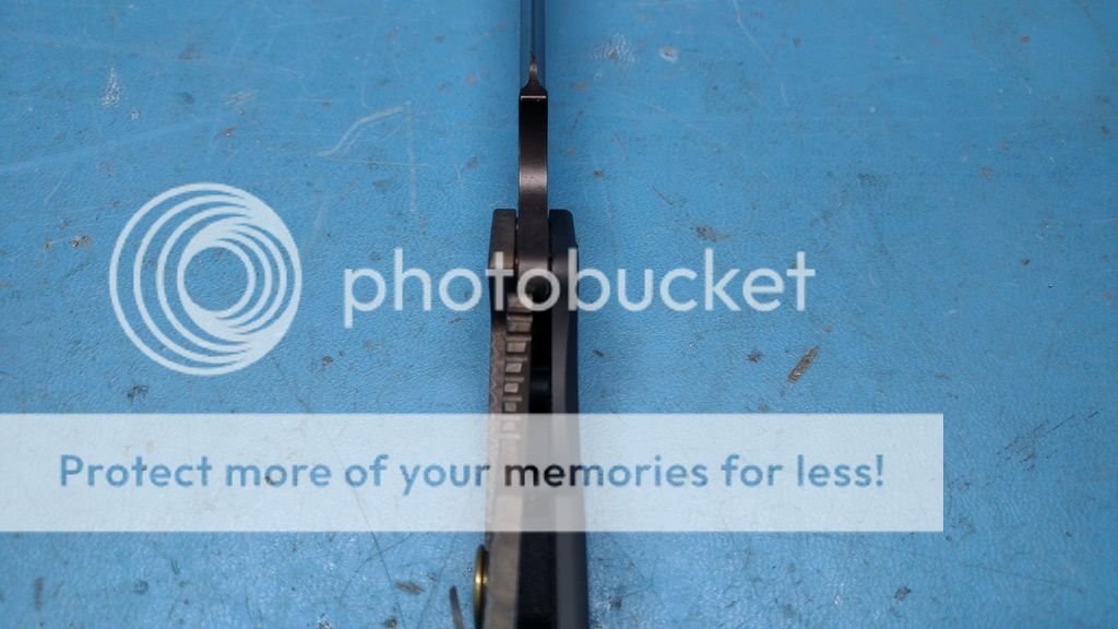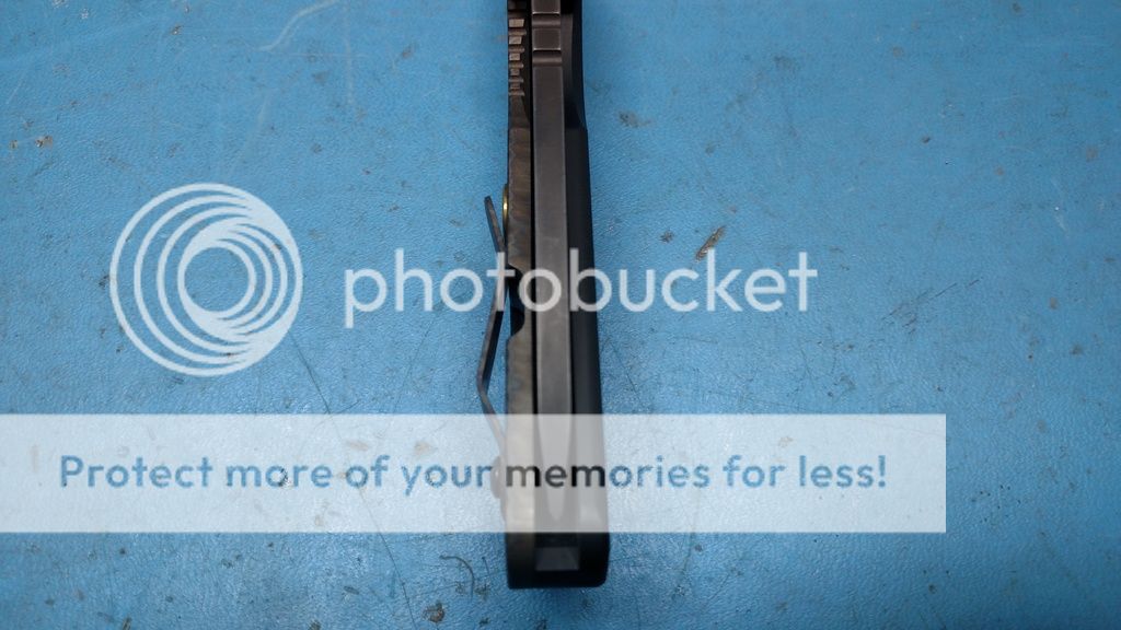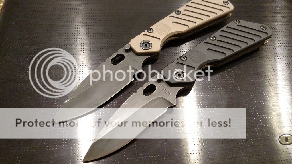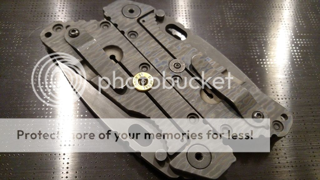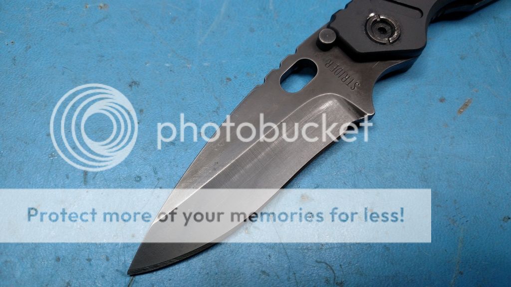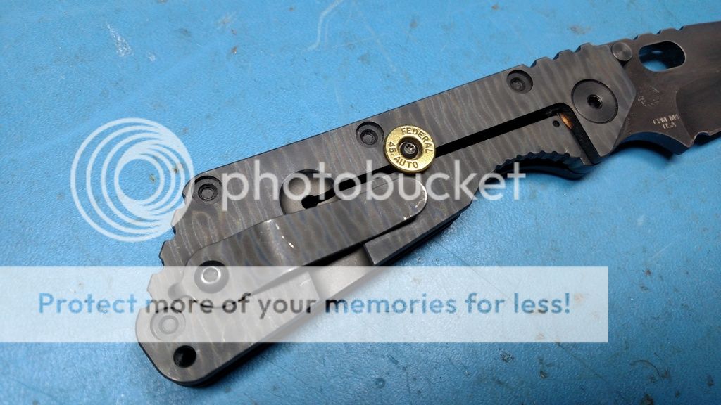 Black Aluminum SMF with CPM M4 blade!!! According to the gentleman I got it from, the previous owner dinged the blade at some point, so Strider fixed it by regrinding the blade to a recurve profile. Pictures seem to show more wear than is visible when just holding the knife, but it is a little more of a user than the first, in excellent condition however. Aluminum has a small scuff right next to the pivot screw that looks like the anodized finish was scuffed away, doesn't really go beyond that into the scale.
