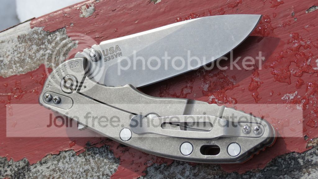Hinderer XM-18 3.5" Slicer. I can swap the scale to FDE (dark brown) if you prefer. Stonewash S35VN blade. Haven't seen these available from a dealer for a while. Let me tell you how this knife differs from "like new." One, there is a long micro line on the presentation side of the blade that can be seen in certain light and at a certain angle. (I couldn't photograph it.) Two, there is slight marring of the slot edges on the pivot screw and on the pivot. I'm happy to dig up a mint pivot screw and install it if that helps. All of this is aesthetic...none of it affects the function of the knife.